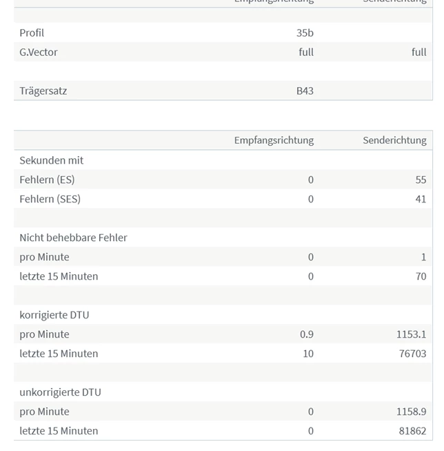 Zum Anfang hatte ich hohe Werte bei der Empfangsrichtung, da habe ich das mitgelieferte TAE-F RJ45 Kabel zum Testen genommen und mein selbstgekaufte TAE-F RJ45 von der Fritzbox 7530 getrennt.