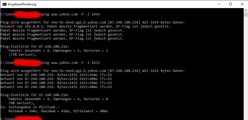 Bei der MTU-Größe, die bei 1500 liegen sollte ist bei 1432 Schluss: