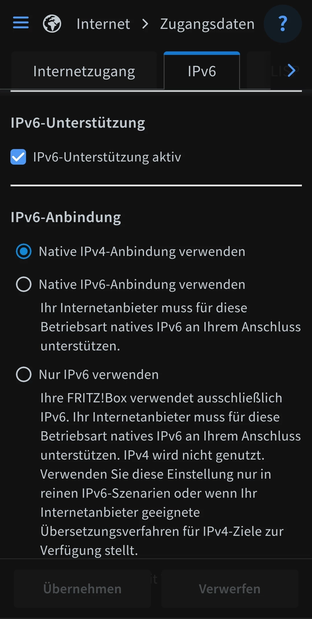 Wenn nicht, muss IPv6 unter "Internet" >> "Zugangsdaten" noch aktiviert werden.