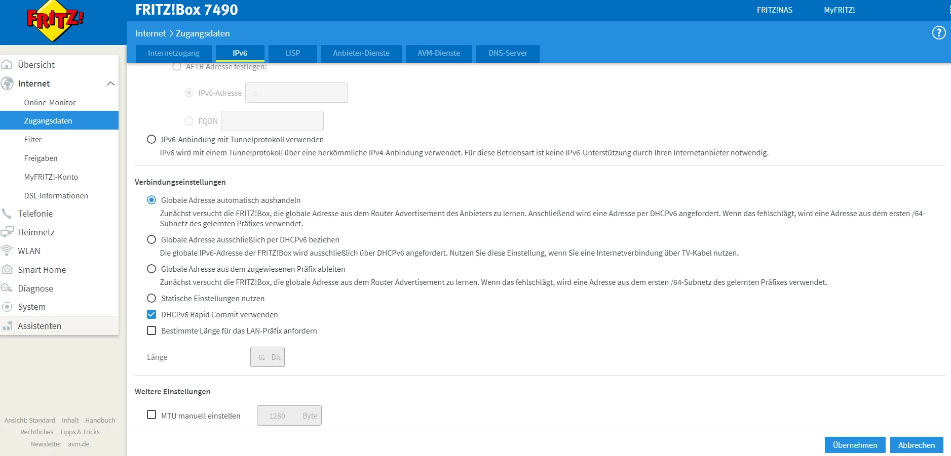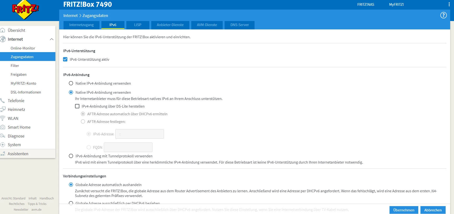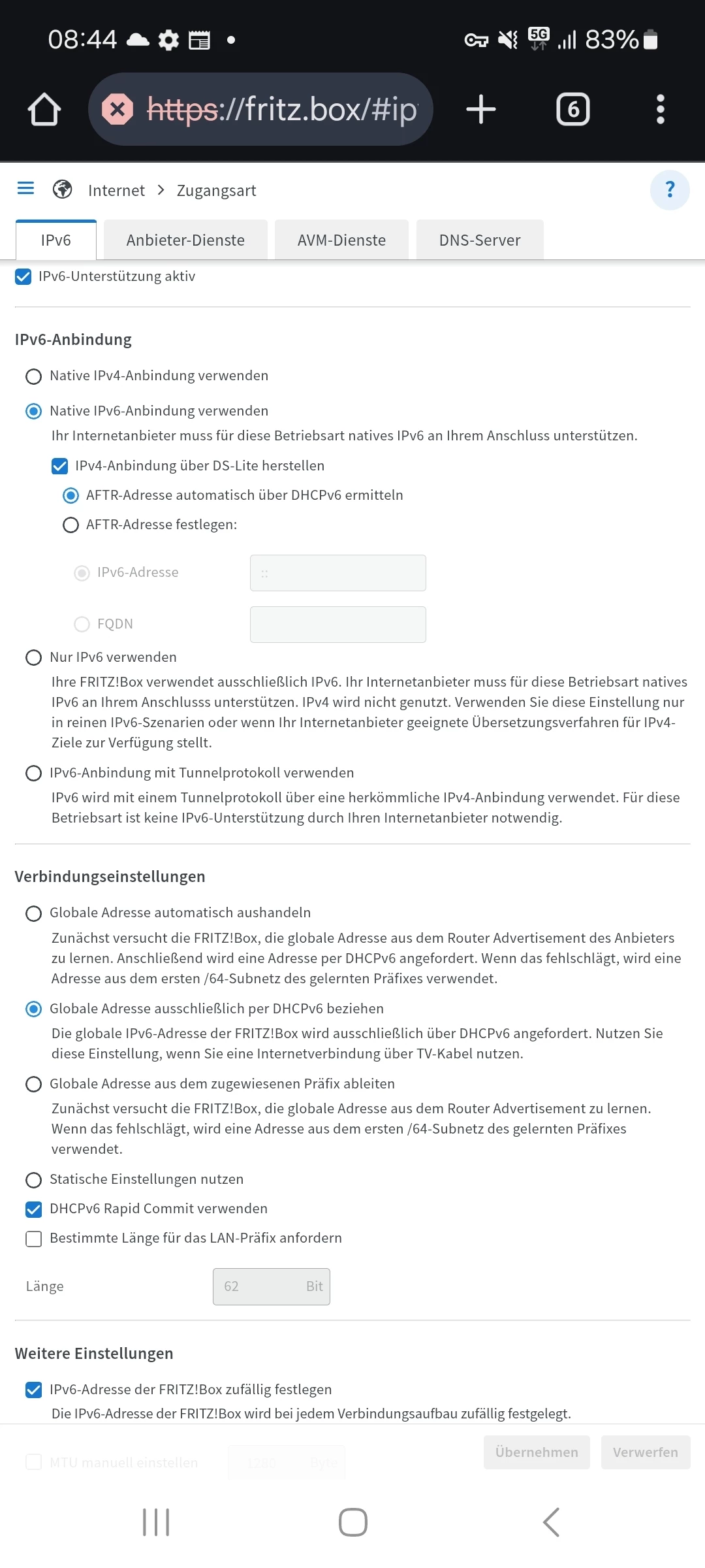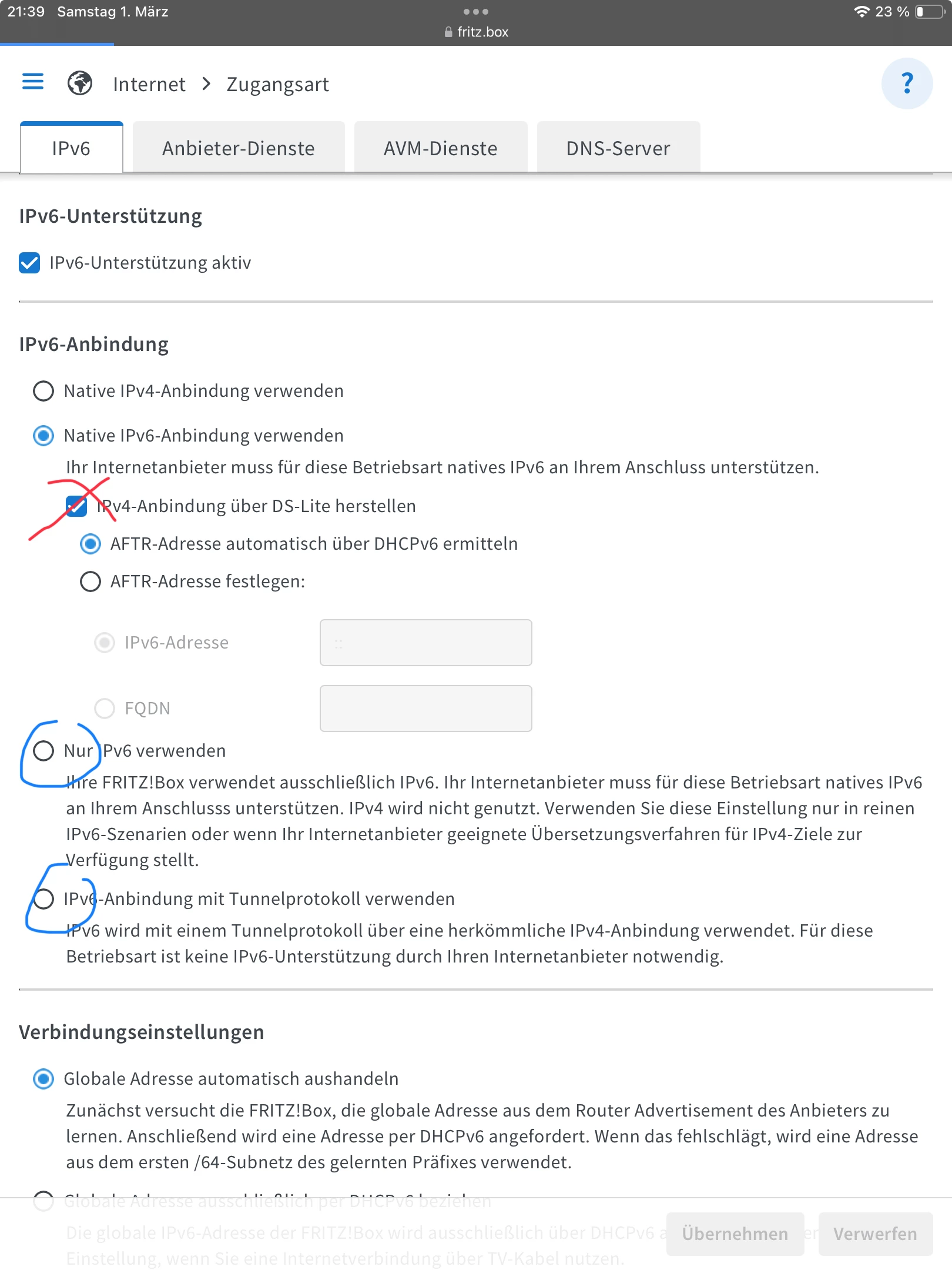 Ich möchte den Internetzugang via IPv6 nutzen so dass ich per WireGuard VPN Tunnel per Smarthome die Wohnung ansteuern kann. Dazu würde ich blaue Optionen auswählen und rote löschen. Wenn ich das allerdings mache dann bekomme ich keine Verbindung zum Internet. Deswegen war mein Verdacht dass der Anschluss nicht für IPv6 freigeschaltet war.