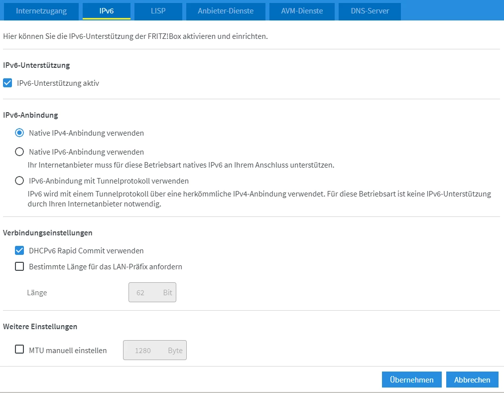 Zur Info, falls noch jemand danach suchen sollte: Ich habe wie unten im Screenshot die Einstellungen vorgenommen, im Online-Monitor auf “Neu verbinden” geklickt und dann war die IPv6 Verbindung da (scheinbar war kein Neustart der Box erforderlich).