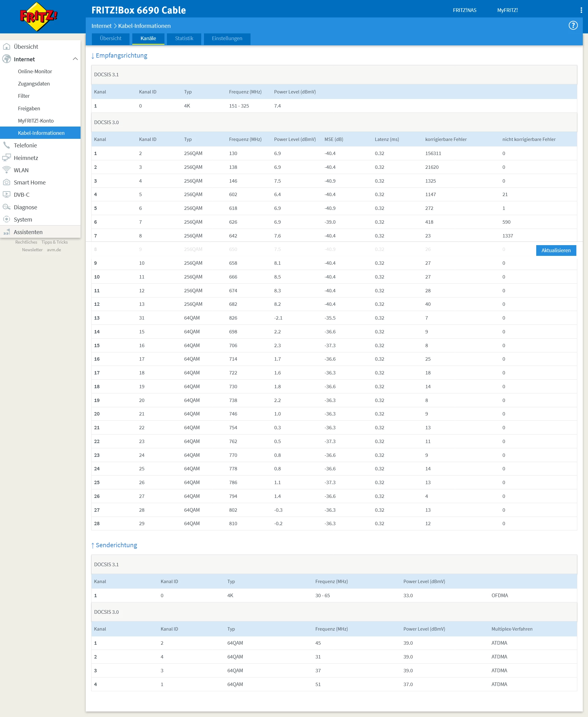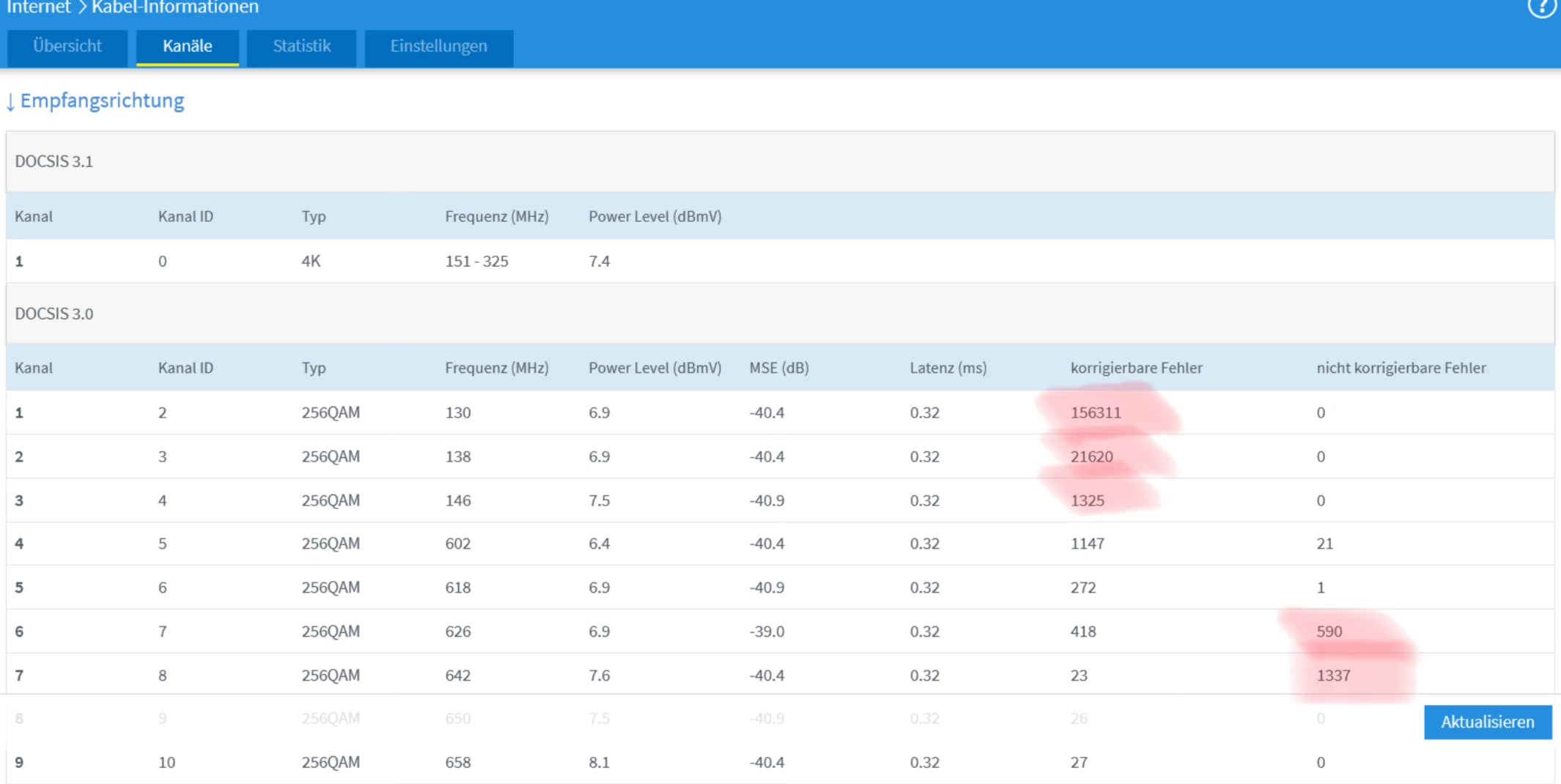 es bleibt in etwa bei der Geschwindigkeit - Download etwa zwischen 500 und 650 Mbit, Upload erreicht 20-35 Mbit. Habe Dir mal einen Screenshot mit den Ergebnissen angehängt. Ist es normal, dass bei den Kabelinfos so viele Fehler angezeigt werden? Das ist jetzt das Aufkommen seit einer guten Woche.