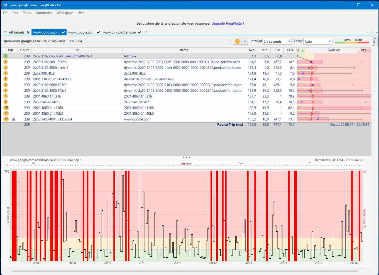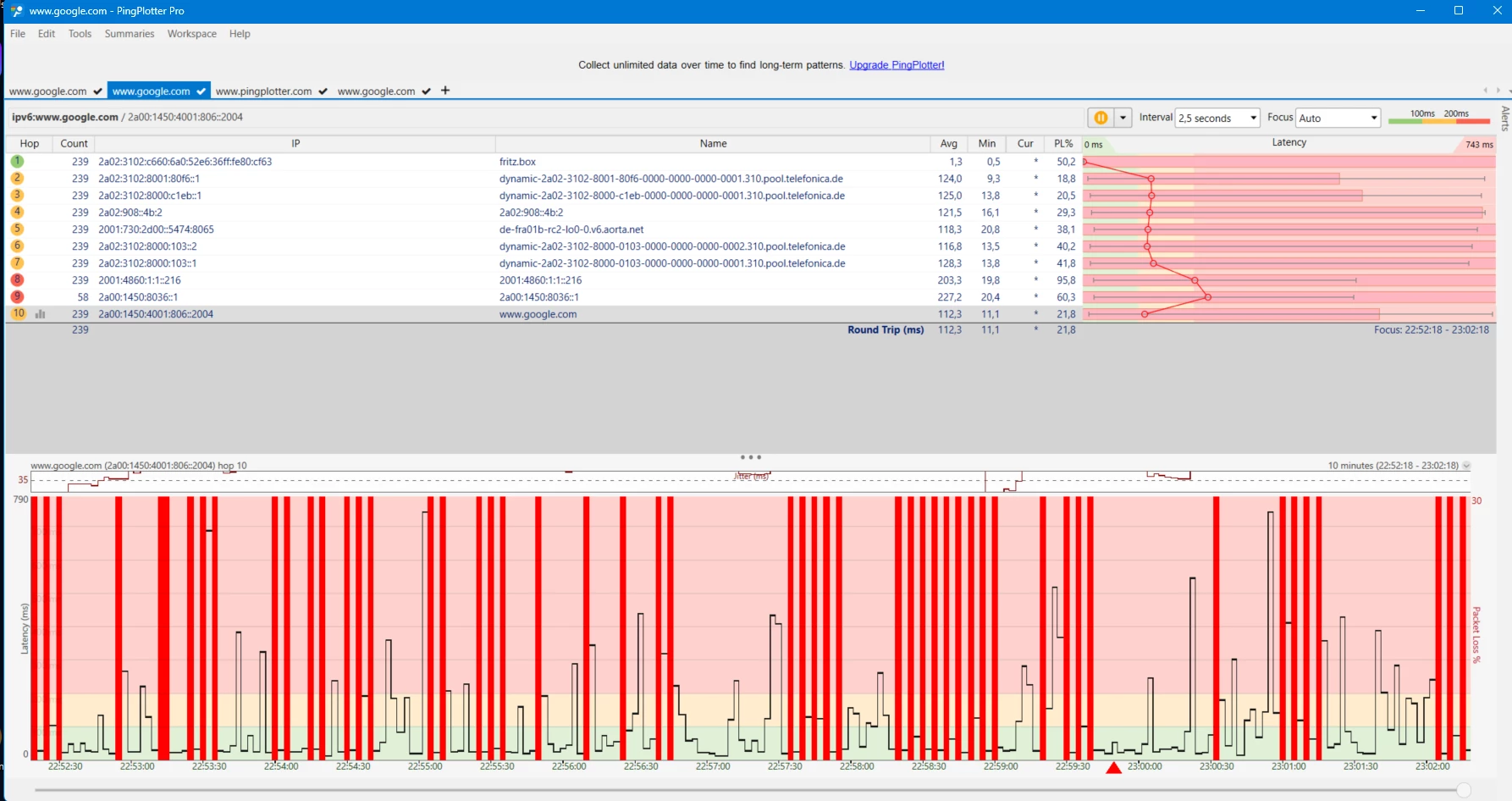 Hier mal einige Bilder von meiner PingPlotter Achterbahnfahrt: