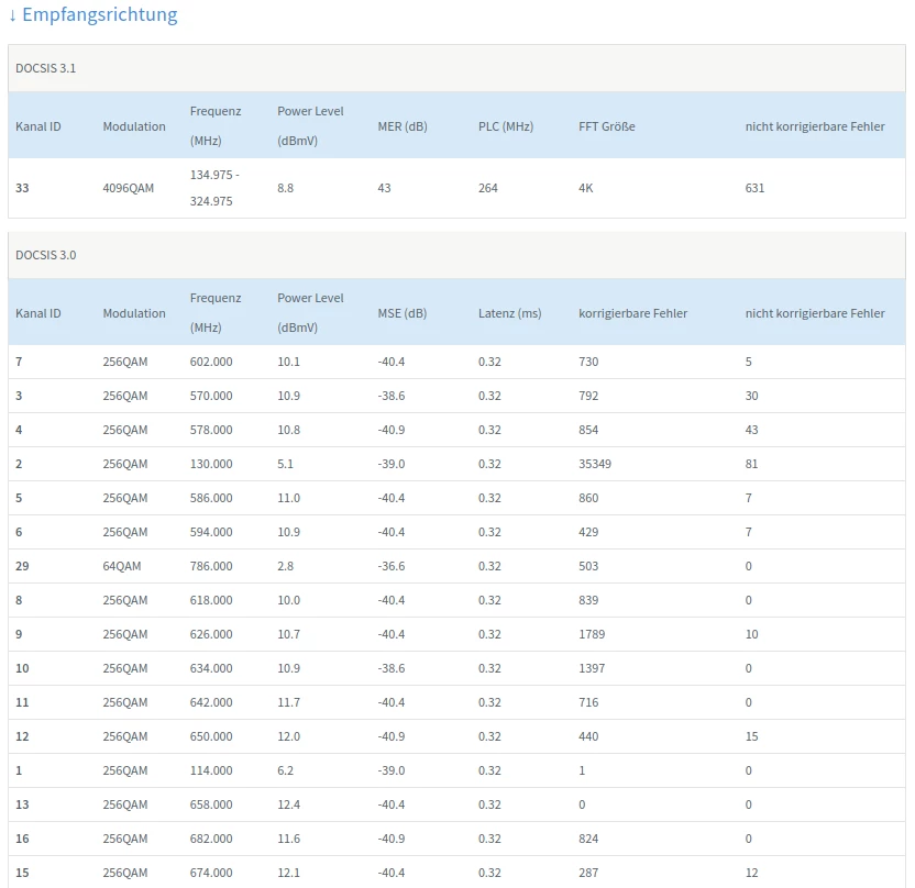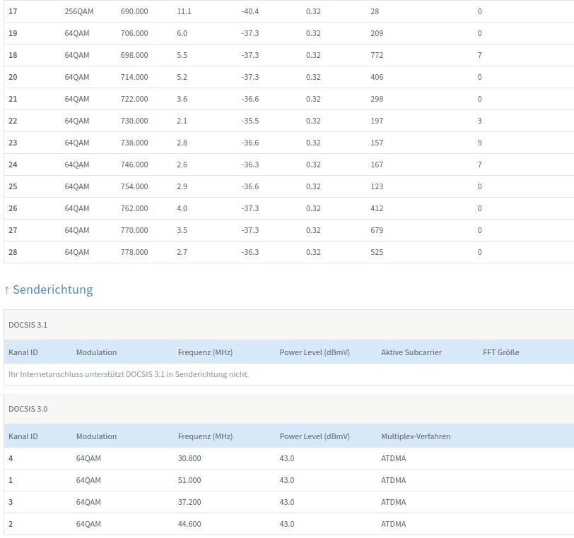 Ich hab hier mal die Kanäle in Senderichtung gepostet, für mich stimmen da weder die Modulation (128QAM statt 4K) noch die Sendepegel 36.0dBmV statt 44-47dBmVv (lt. BK Grenzwerte DOCSIS 3.1 Sendepegel)