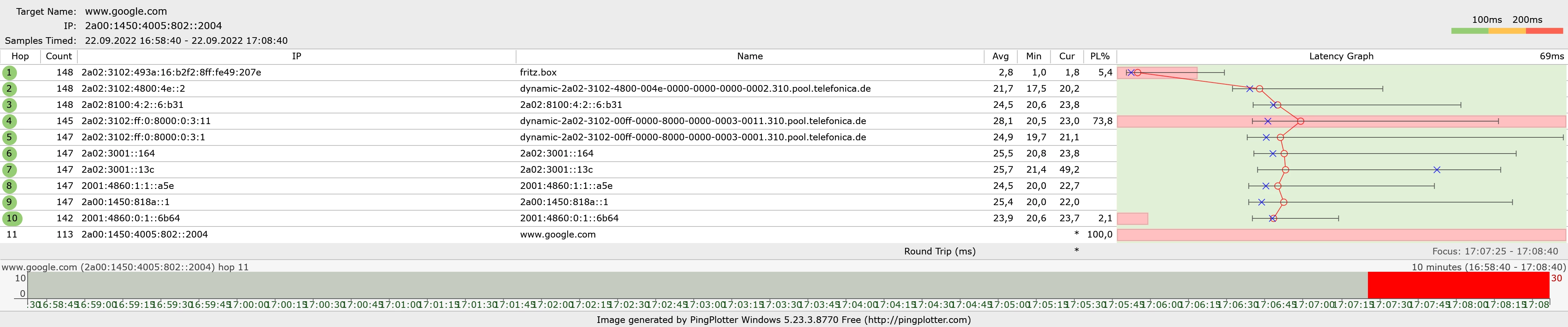 Screenshot aus Pingplotter, verschiedene Ziele: