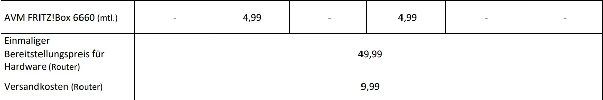 Die Fritzbox 6660 kostet mtl. 4,99€ + einmalig 9,99€ Versand + einmalig 49,99€ Bereitstellungskosten.