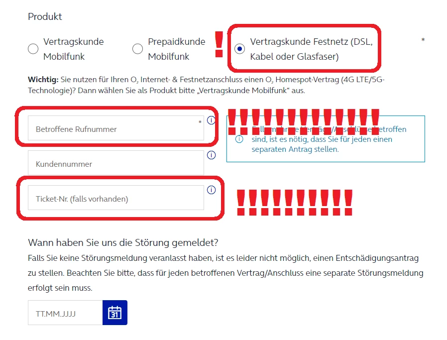 wieso sollte ich da eine mobilfunknummer eintragen?!?!! wo ich doch extra darauf geachtet habe seit dieser schiefen kündigung meines mobilvertrages obwohl festnetz gemeint war! und wieso gibt es ein feld mit TICKETNR.? wieso gibt es den haken “DSL, Kabel” usw. ?? was stand denn in diesen feldern?? landet man bei DSL kabel bei mobilfunk? landet man bei meiner ticketnr bei mobilfunk? wieso ist es so kompliziert, eine entschädigung einzufordern? obwohl die ganzen fehler um meinen kabel vertrag bestanden, lief das abbuchen auf anhieb reibungslos! is doch komisch. 🤷🏻