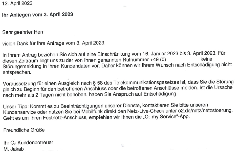 ich habe mir deinen Entschädigungsantrag gerne einmal angeschaut. Hier ist eine Ablehnung erfolgt, weil unter “betroffene Rufnummer” eine Mobilfunknummer eingetragen war. Unsere Mitarbeiter konnten dafür keine Störungsmeldungen finden.
