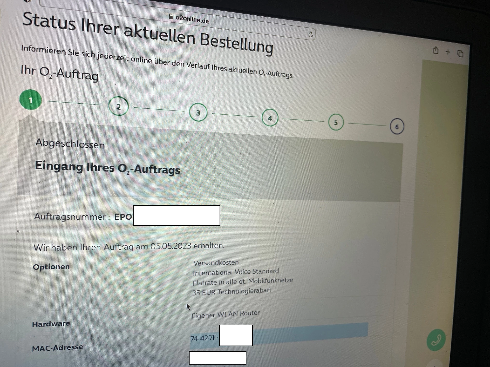 nach wie vor steht in der Bestellung die alte und wenn ich anrufe heißt es immernoch die Mac Adresse ist falsch. Seit 07.06. rude ich und bekomme jedesmal mitgeteilt dass die Mac Adresse falsch ist.