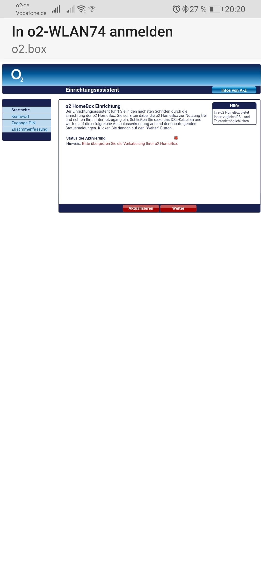 Hab due O2 HomeBox 6741 Power und WLAN leuchtet! Und wie gesagt, bekomme immer gesagt, das ich die Verkabelung kontrollieren soll! Liegt es eventuell an den Hazsanschluss? Muss bis Freitag unbedingt Internet haben