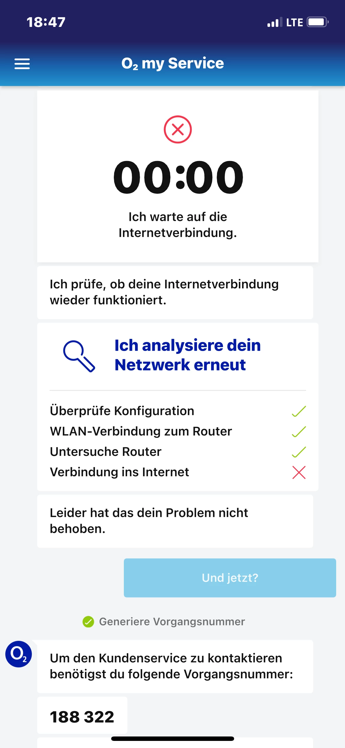 Ich habe über iPhone in App „o2 my Service“ Problemlösung ausgeführt, App hat mir ein Vorgangsnummer erstellt. 188 322
