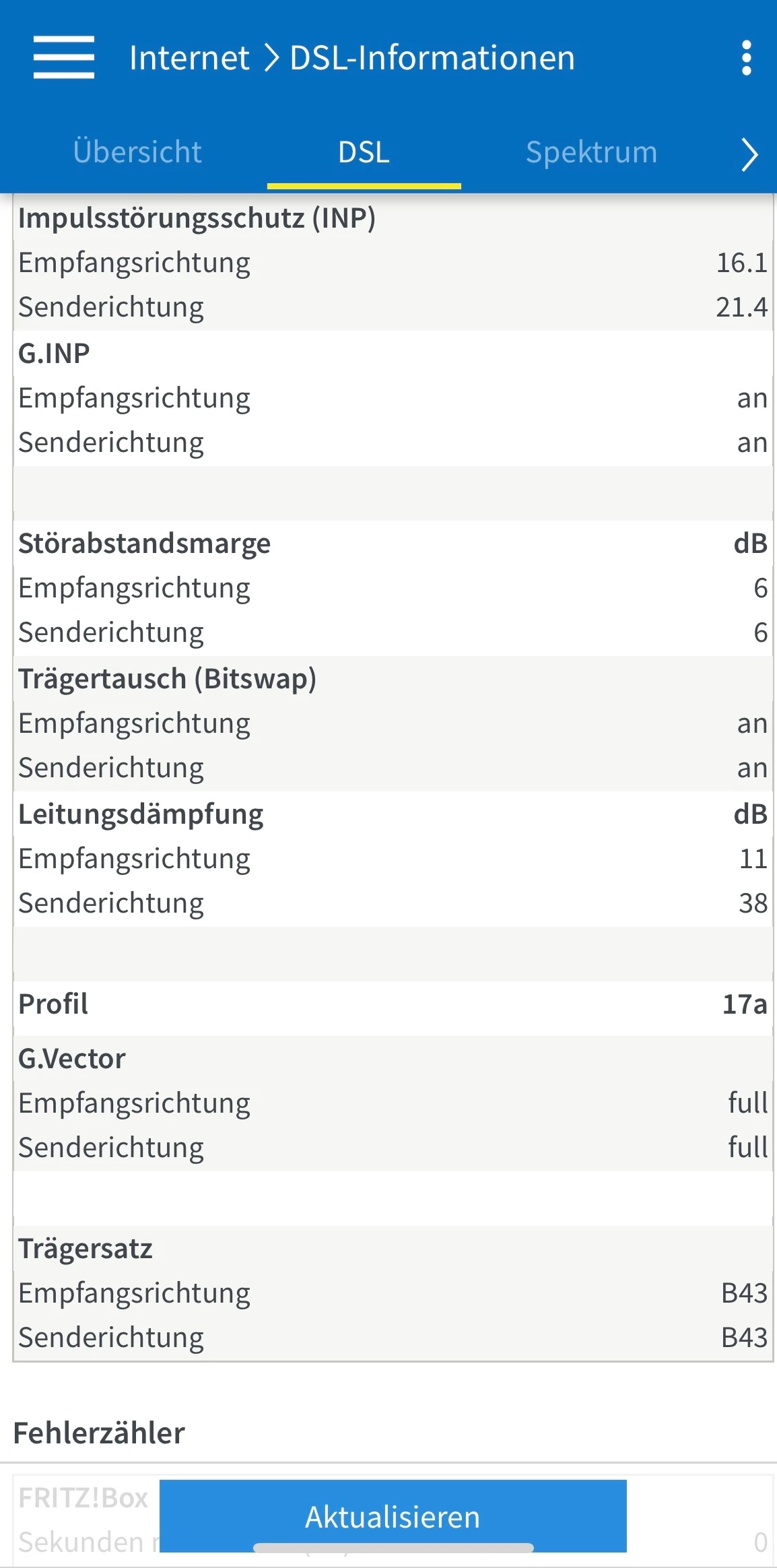 Seit Dienstag Nacht haben wir nun allerdings immer wieder DSL-Abbrüche, teilweise sogar 10 Stunden am Stück. Wenn dann wieder ein Sync zustande kommt, sieht man dass die Dämpfung der Leitung und das Spektrum miserabel ist (siehe Screenshots im Anhang, alle Fehlerzähler waren auf 0, das fehlt hier im Screenshot). Die o2 Hotline wollte mir bislang nicht wirklich helfen, mit dem Verweis darauf, dass die 7390 am Vectoring-Anschluss nicht zuverlässig laufen würde. Aber was hat die CPU-Leistung der Fritzbox denn mit der Leitungsdämpfung und dem Spektrum zu tun?