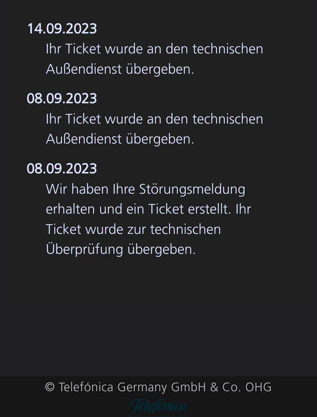 Habe dann am 13.09. versucht anzurufen, kam aber nicht durch. Diese blöde AI Aura meinte immer, das eine Störung ist und ein Ticket in Bearbeitung ist. Und dann wurde aufgelegt.