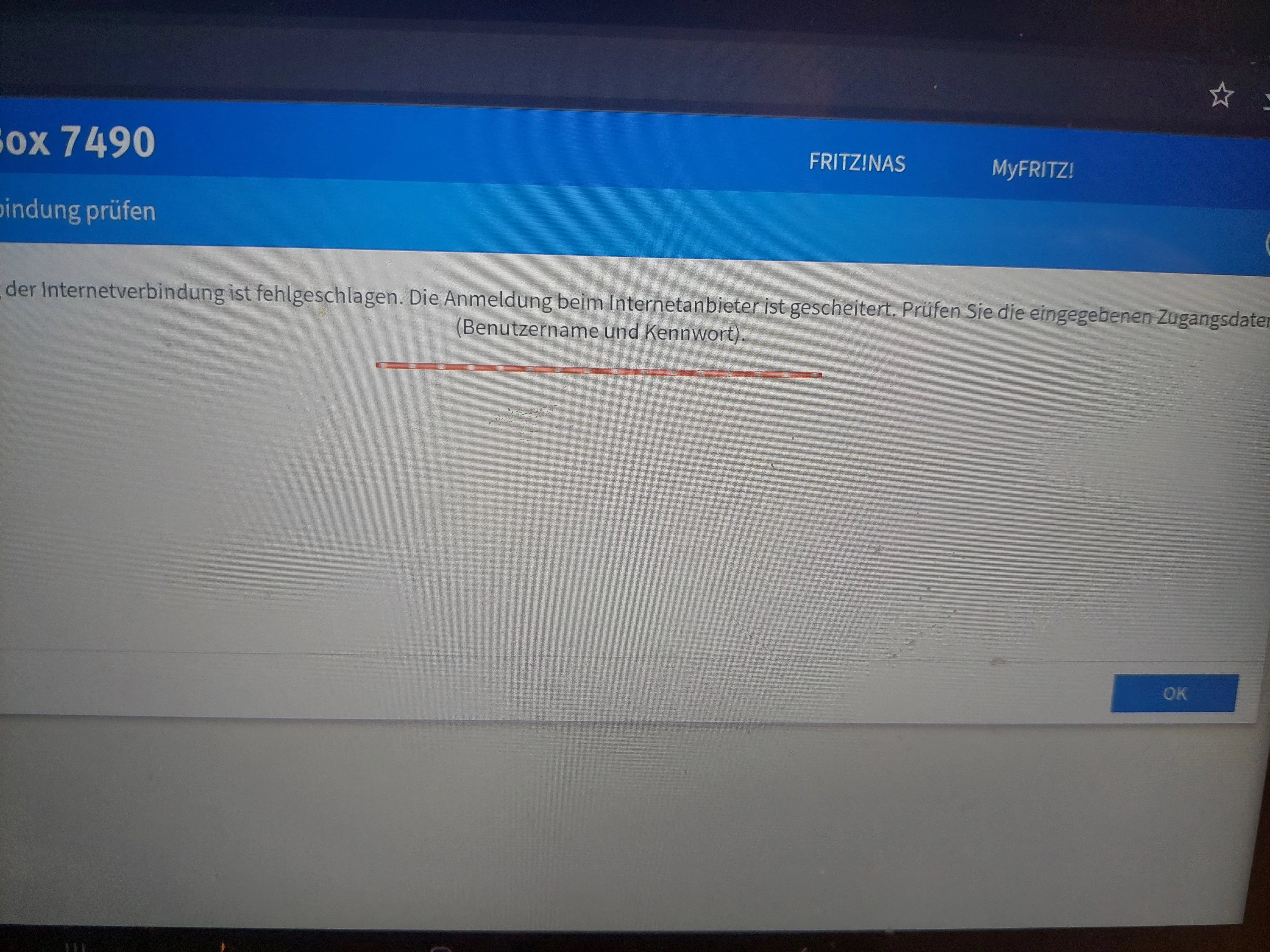 Hab Lles nochmal eingeben wie hinterlegt -> Daten werden gespeichert -> überprüfung der internetverbindung -> fehlgeschlagen Benutzername und Kennwort falsch danach ist wie oben schonmal ein Bild hochgeladen. Das Passwort mit * 4 stellig nicht mehr 10 stellig wie es sollte angezeigt. Der Benutzername bleibt hingegen so wie ich ihn eingebe. Wenn ich das PW eingebe ist es auch im klartext und nicht verschlüsselt. Ich weiß nicht warum die fritzbox nach dem Vorgang auf 4 stellig setzt. Hatte ja gehofft, dass das durch die werkseinstellung behoben wird. Hatte auch schon überlegt bei AVM diesen Fehler mal anzufragen. Aber erstmal eins nachdem anderen 😅