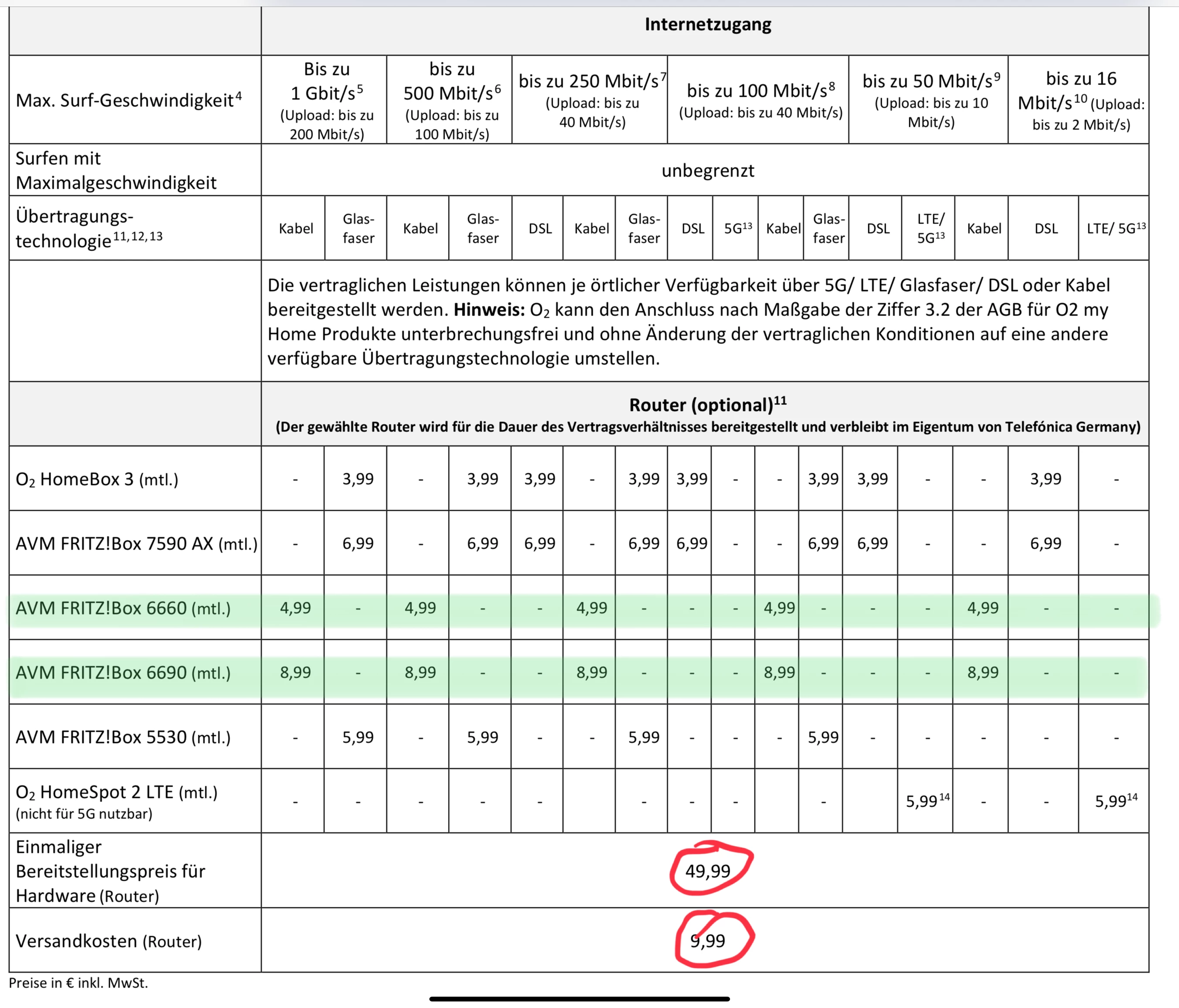 Du zahlst dann 49,99€ + 9,99 Porto einmal und 4,99€ AVM 6660 oder 8,99 AVM 6690 im Monat.