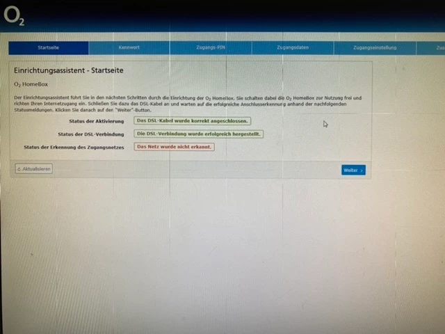 Nimm den Hörer ab bzw. drücke die Freisprech/Lautsprecher-Taste und folge den Anweisungen der Stimme. Lege den Hörer erst auf, wenn die Stimme dich im Netz von O2 willkommen heißt und "Power", "DSL", "WLAN", "Internet", "Telefon" und "Info" grün leuchten.