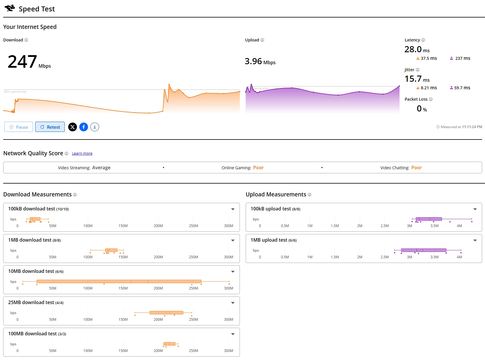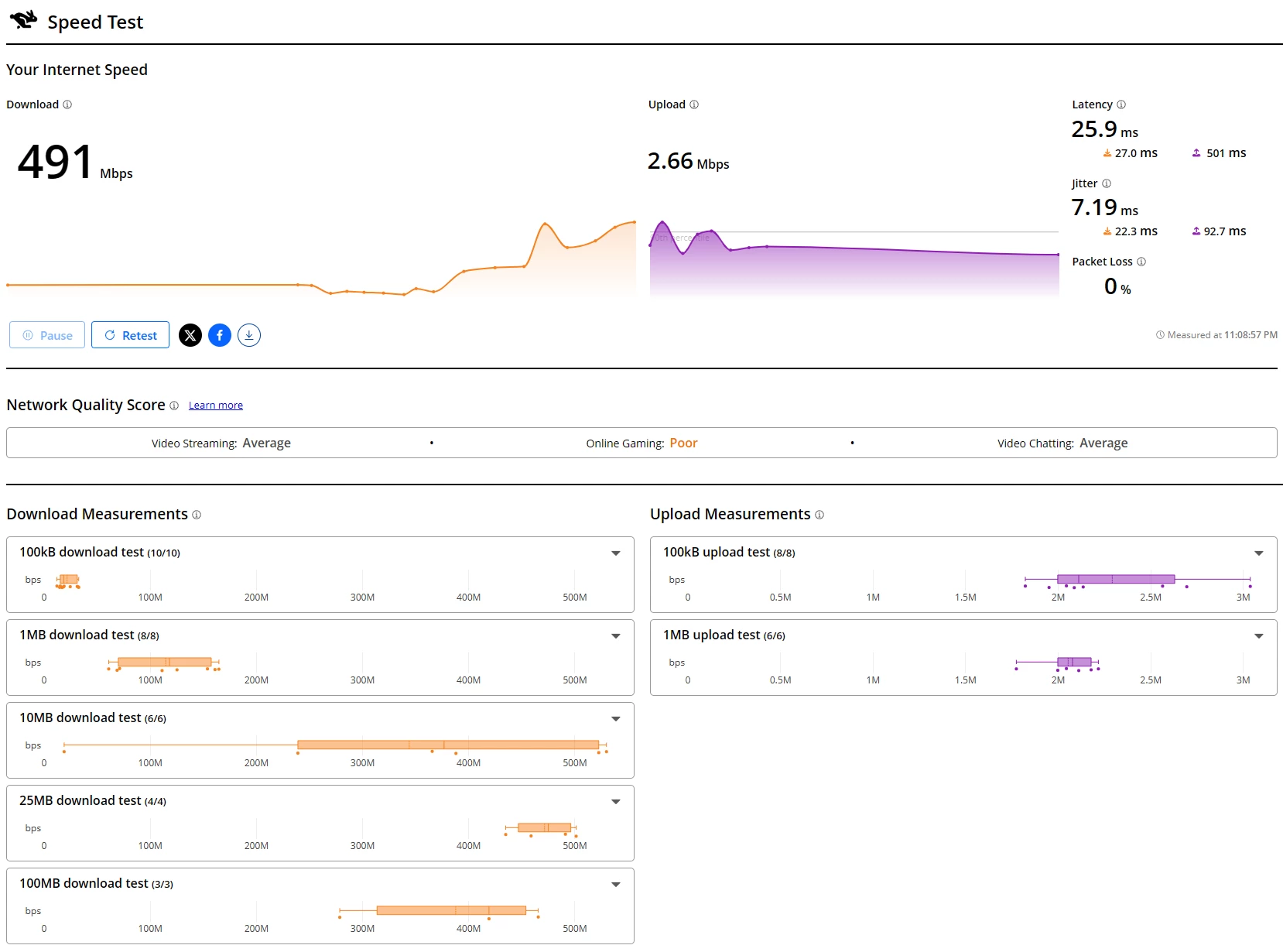 Jetzt habe ich erneut das gleiche Problem, dass die Verbindung innerhalb einer Stunde mehrmals 2-5 Sekunden abbricht und sich neu verbindet. Insbesondere das Gaming leidet immens unter Latenzen und Paketverlusten. Startet man einen größeren Download, kann man den Einbruch der Downloadgeschwindigkeit sowie das vollständige Aussetzen beobachten. Download und Upload Geschwindigkeiten schwanken auch total - Upload jedoch mehr als Download