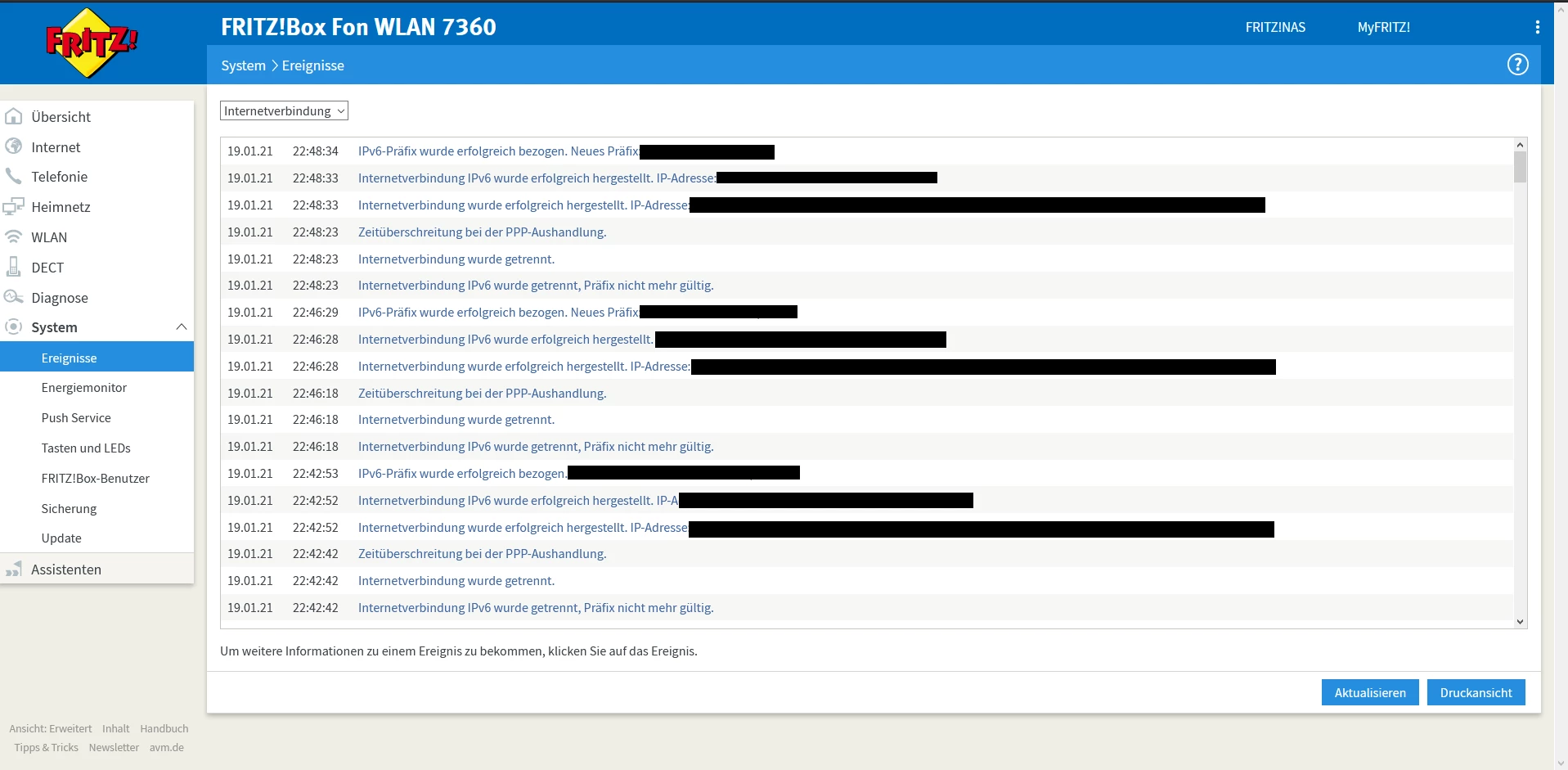 Diese Probleme treten sehr unregelmäßig auf. Teilweise mehrmals am Tag, aber dann auch wieder 1-2 Wochen gar nicht. Auch die Dauer ist sehr unterschiedlich. Ich hatte auch schon einen anderen Router dran, bei dem genau das Gleiche passiert.