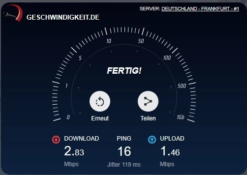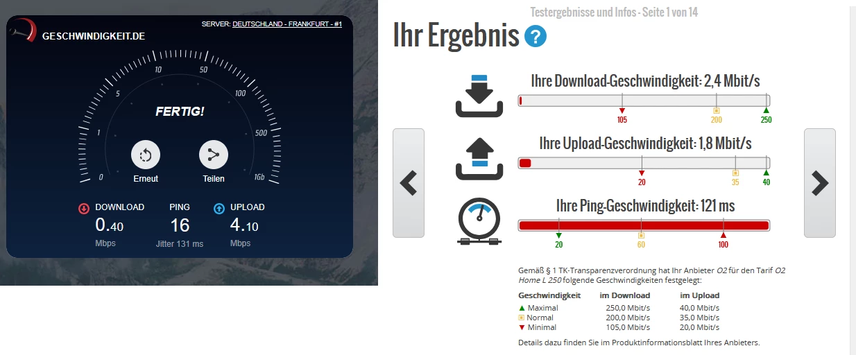 Die 250Mbit Leitung bewegt sich aber im Bereich von 1-2Mbit. Streckenweise im kbps Bereich.