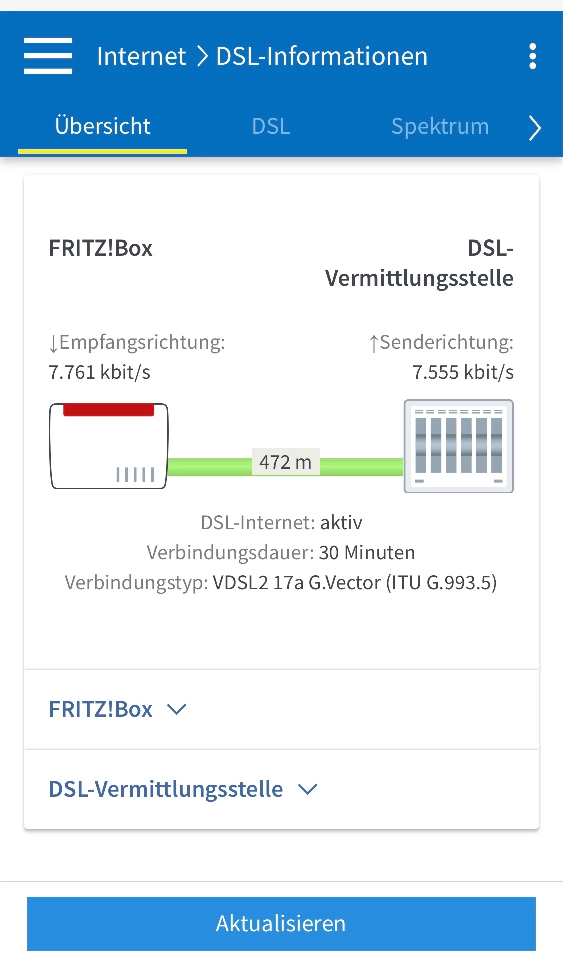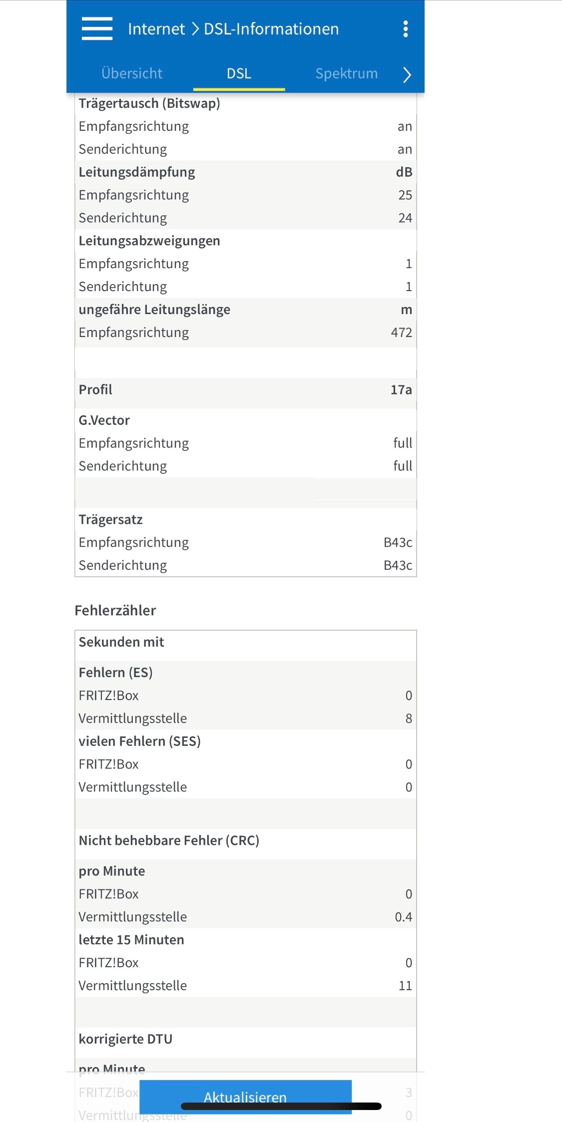 Ich vermute bei deinen Werten einen und mit der Angabe von VDSL 100  Vectoring Anschluss und das die G-Vector Einheit ausgefallen ist.