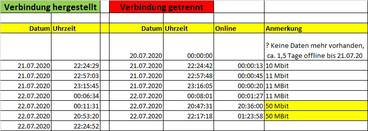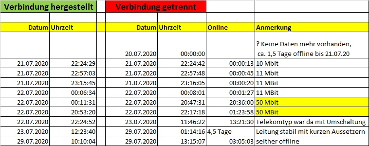 So, die Leitung scheint seither stabil zu laufen - nur die Upload Rate ist mit meist unter 2 MBit deutlich geringer als vor dem Problem. Download ist seit der Problembhebung aber konstant bei 50 MBit und Abbrüche gab es seit den letzten am 22.07.2020 auch keine mehr.