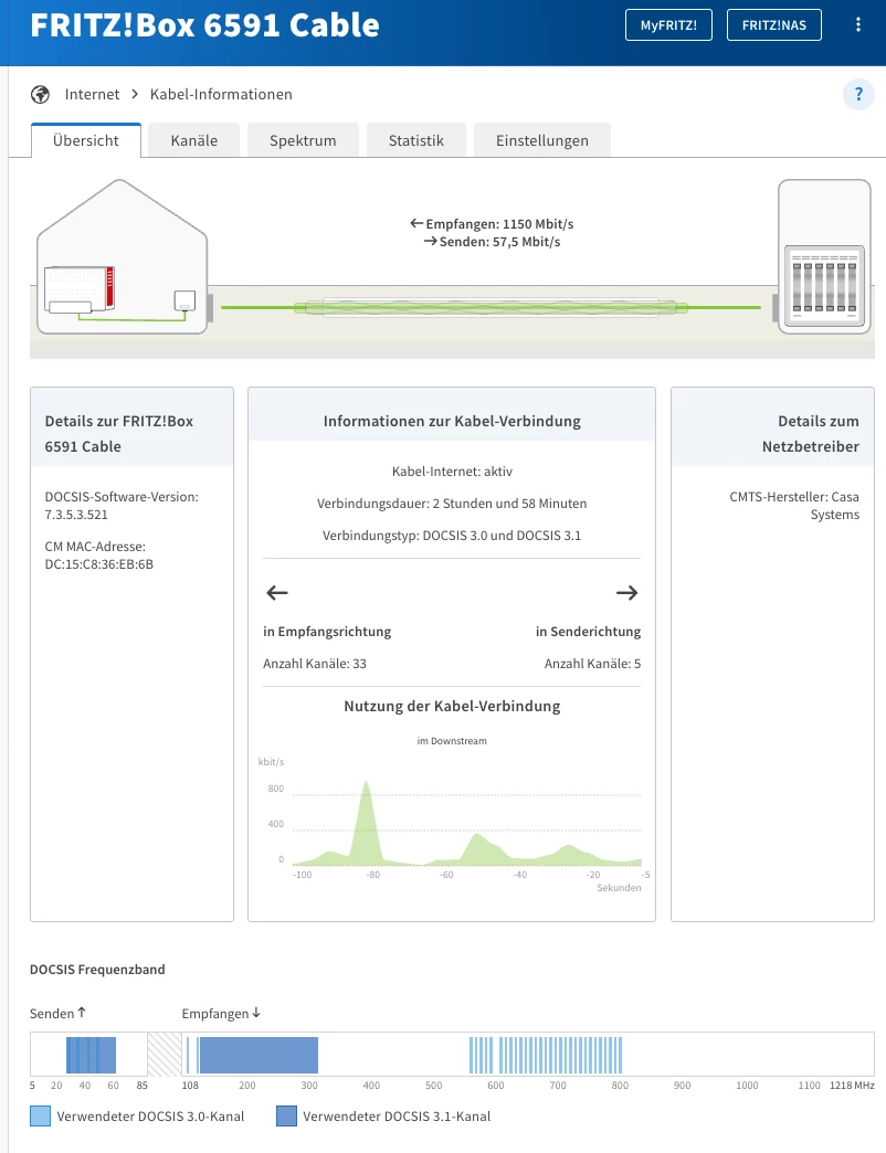 Anschluss: O₂ Kabel, 1000 Mbit/s Down / 50 Mbit/s Up