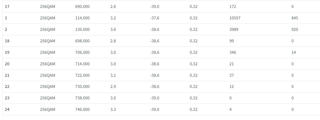 Ah, 16QAM bei 2 der 5 Upstreamkanaele, das ist mindestens ein milder Fall von Rueckwegstoerung, und  Ueberlast scheint auch im Spiel zu sein… (64QAM erlaubt 6 Bit pro Symbol, 16 QAM nur 4, d.h. der Rueckwegstoerer verringert die nutzbare Upstreamkapazitaet und das kann dann schnell von “vollem Segment” zu “uebervollem” Segment fuehren).