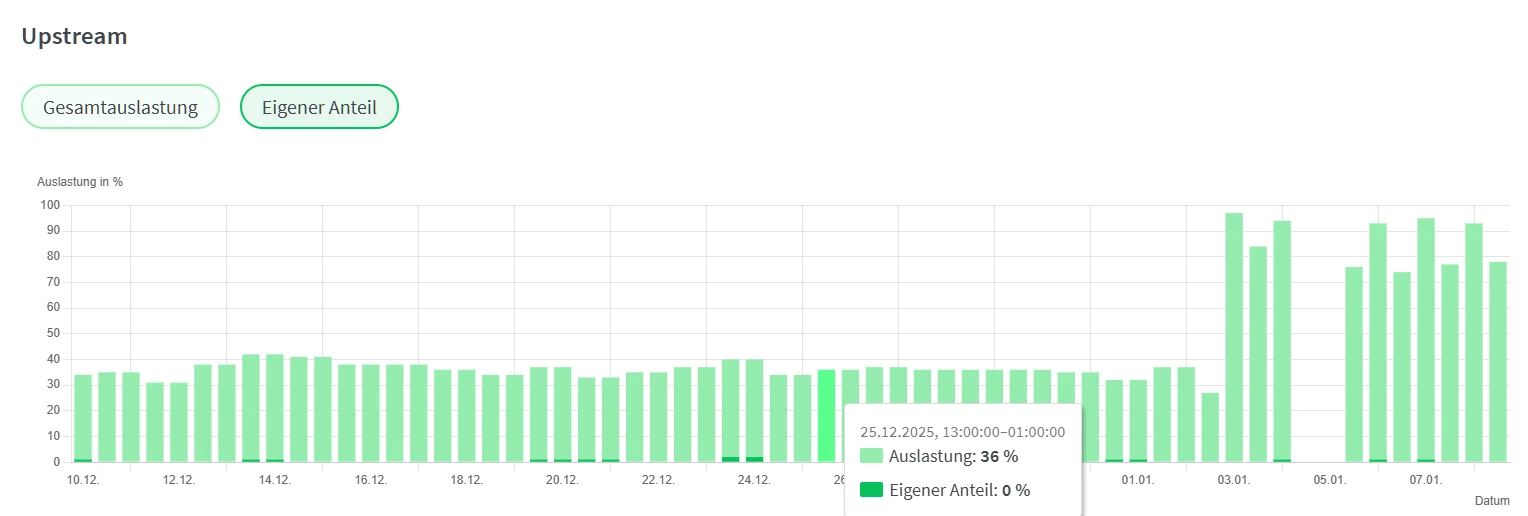 Techniker hat mich angerufen und gesagt das er da nix machen kann. Es sind wohl zu viele Haushalte dran bzw. die die dran sind die nutzen es sehr stark. Aber schon merkwürdig das es von durchgehend knapp 30% Gesamtuploadauslastung am 02.01. um 13 Uhr ca … auf über 90% gesprungen ist. Und das nun durchgehend.