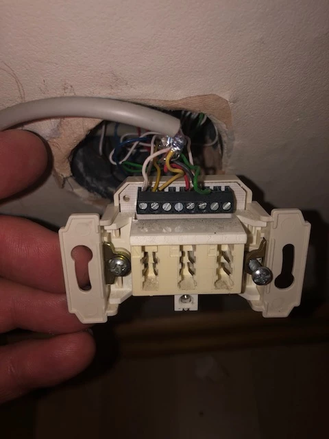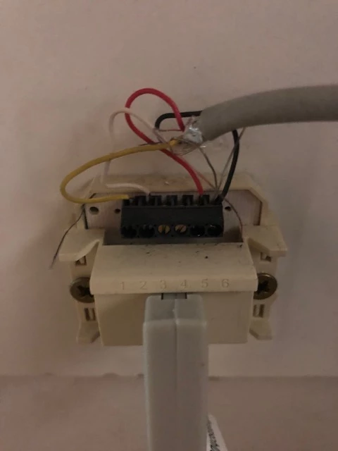 So,das erste Bild ist die Dose die ich mir in meinem Büro montiert habe,das zweite Bild ist die ursprüngliche Dose. Ich hoffe man kann was erkennen.Die Interessanten Kabel sind wohl gelb weiß rot und schwarz. Zwei Kabel kommen vom Anschluß im Keller,zwei gehen zurück in den Keller und von dort in meine obere Wohnung.