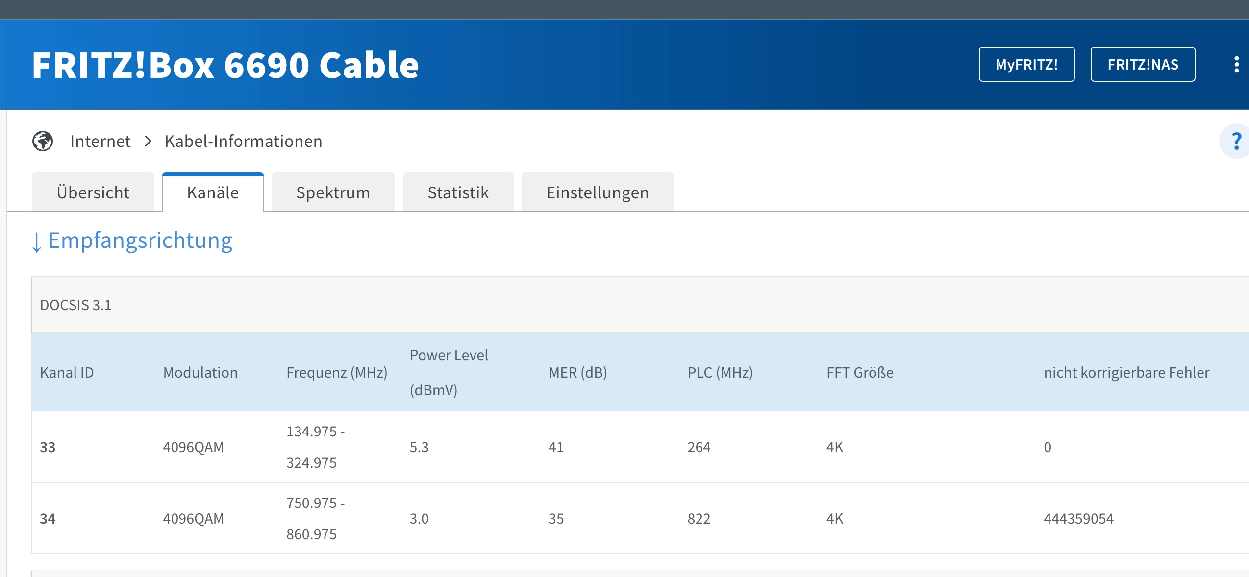 Weiterhin habe ich unregelmäßige Störungen beim Telefonieren (mein gegenüber hört mich zeitweise nicht), sehr hohe Fehler auf allen Docsis-Kanälen, bei Kanal 34 derzeit über 1.5 Milliarden unkorrigierbare Fehler und auch beim Streaming gab es kurze Abbrüche.
