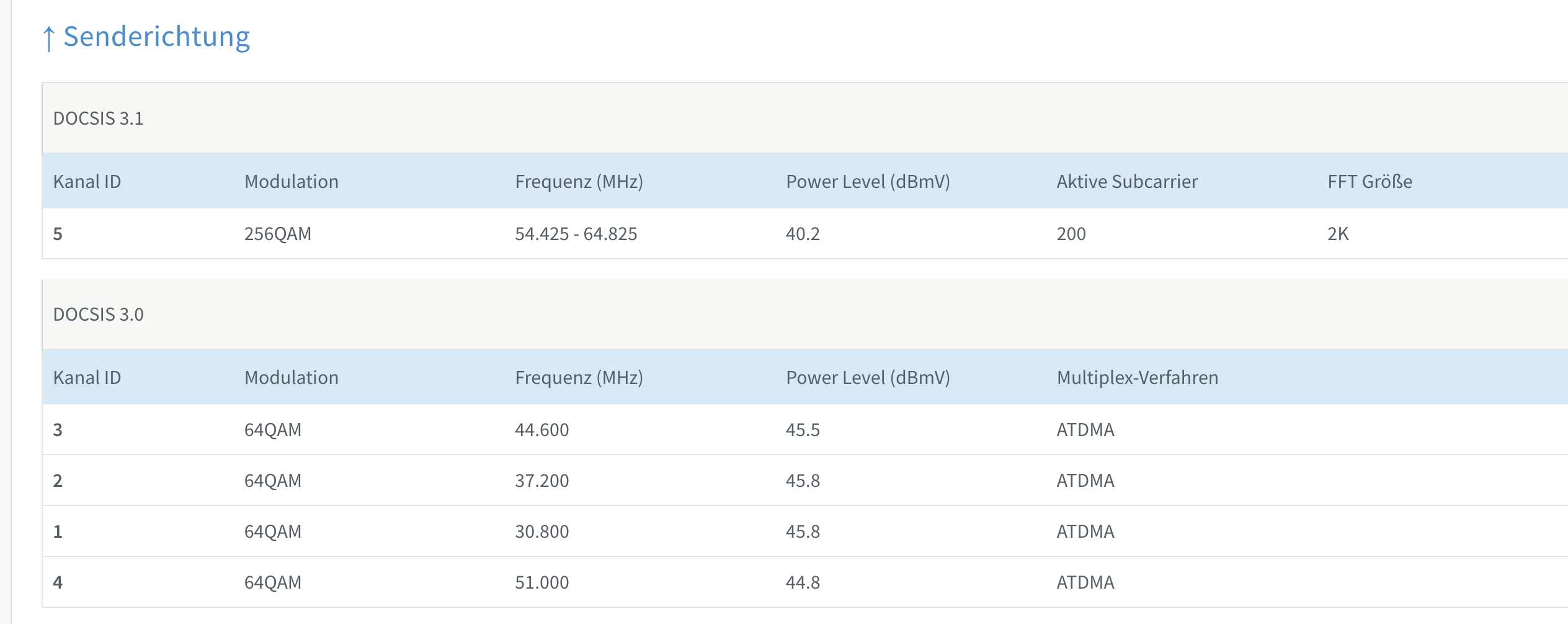 In den ersten Tagen waren die Werte im Download und Upload wie bei Vodafone und im optimalen Bereich. Doch dann sanken beide Werte, teilweise bis auf die Hälfte und ich schaute mir die Modemwerte genauer an. Hier entdeckte ich extreme unkorrigierbare Fehler auf Kanal 34 (Docsis 3.1, Empfangsrichtung) und viele korrigierbare Fehler auf den Docsis 3.0-Kanälen. Auch ein Neustart der Box brachte innerhalb kurzer Zeit wieder einen starken Anstieg der Fehler (bei 34 in die Millionenwerte!).