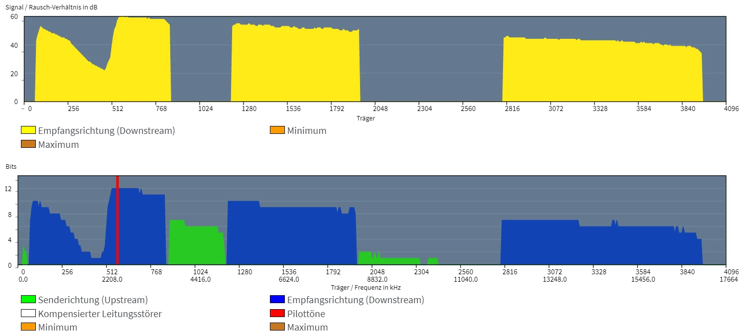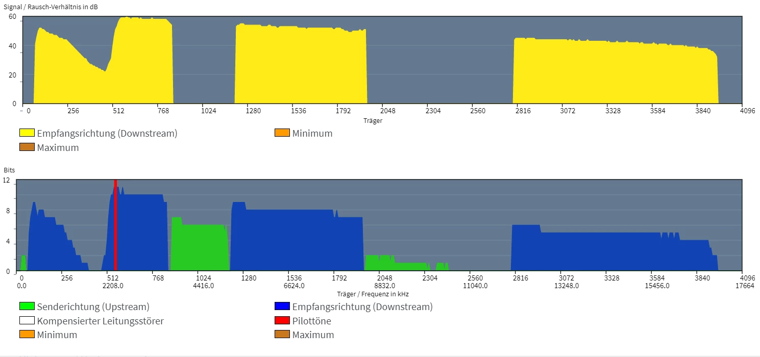 . Zusammenbrechen generell tut die Leitung nicht, sie wird eben nur extrem langsam, verliert die Synchro, verbindet sich neu und nach einer gewissen zeit behebt sich das von selbst. Danach hab ich meine reguläre Datenrate wieder. Die Störsicherheit hab ich auf maximale Stabilität.
