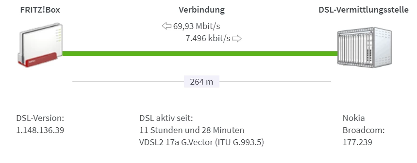 DSL ist verfügbar (DSL-Synchronisierung besteht mit 69938/7496 kbit/s).