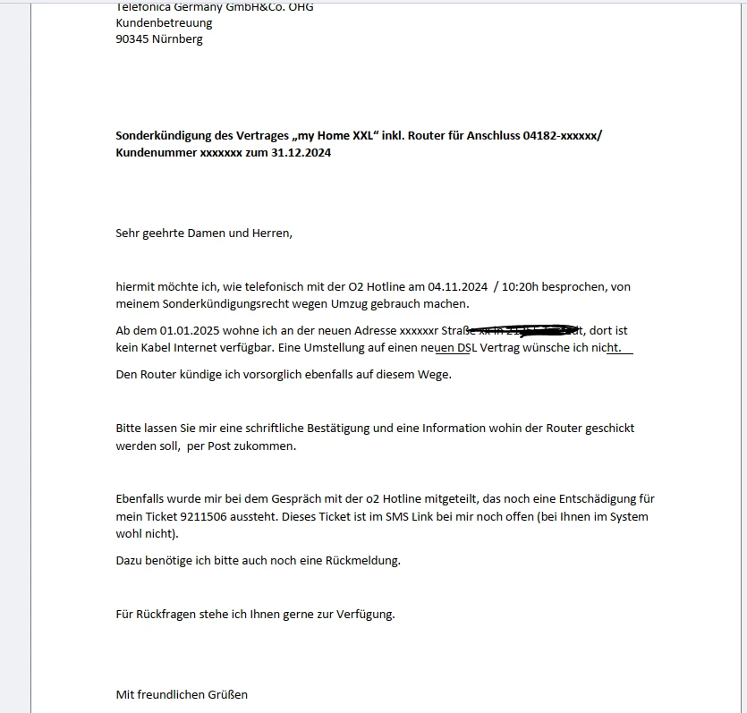 mittlerweile bin ich umgezogen und habe am 04.11. ein Kündigung an O2 geschickt. (Bild anbei) Dann habe ich nochmals bei der Kündigungshotline angerufen, mir wurde bestätigt das ich aufgrund von fehlender Kabel Anbindung ein Sonderkündigungsrecht habe, meine Schreiben (Kündigung zum 31.12.24) angekommen sei und alles ok ist.