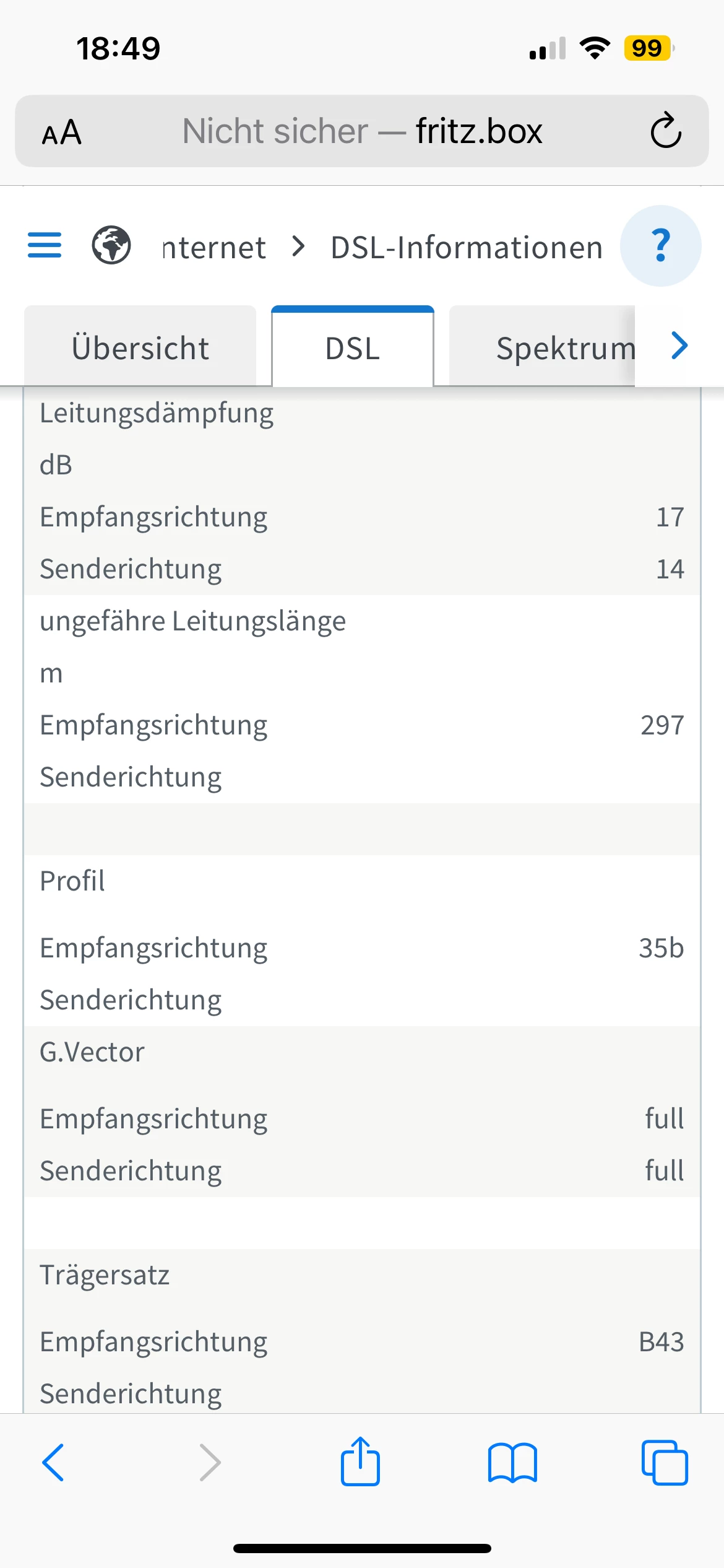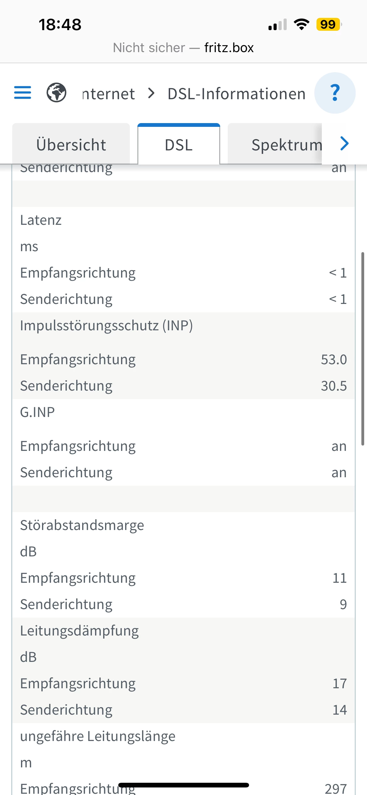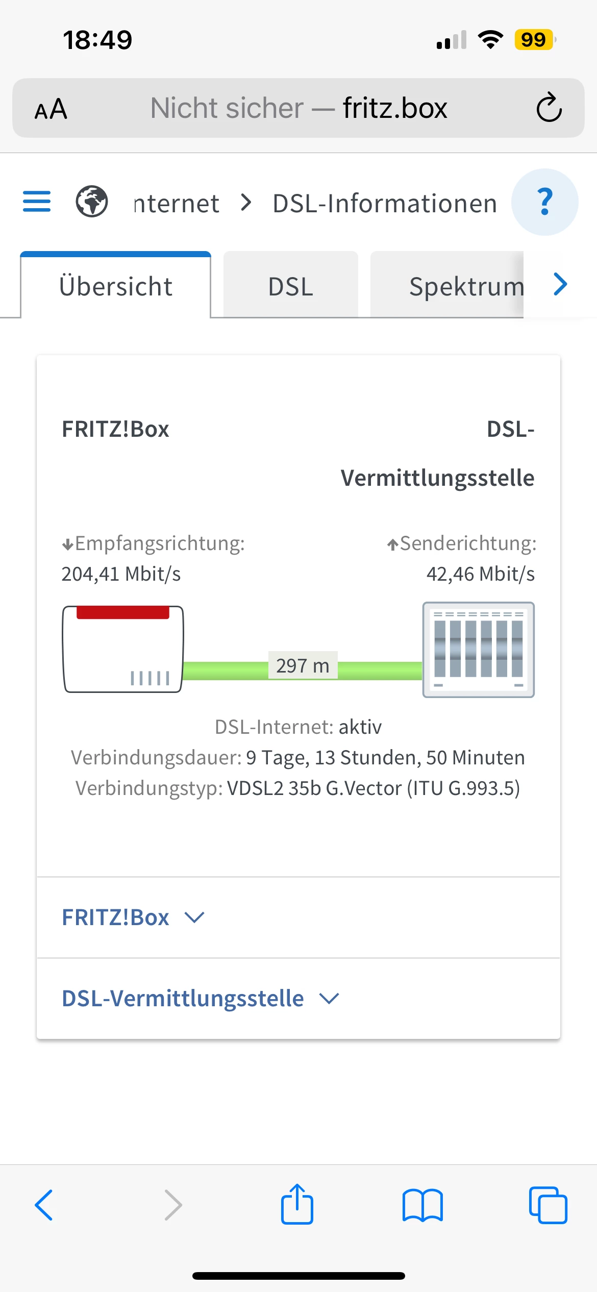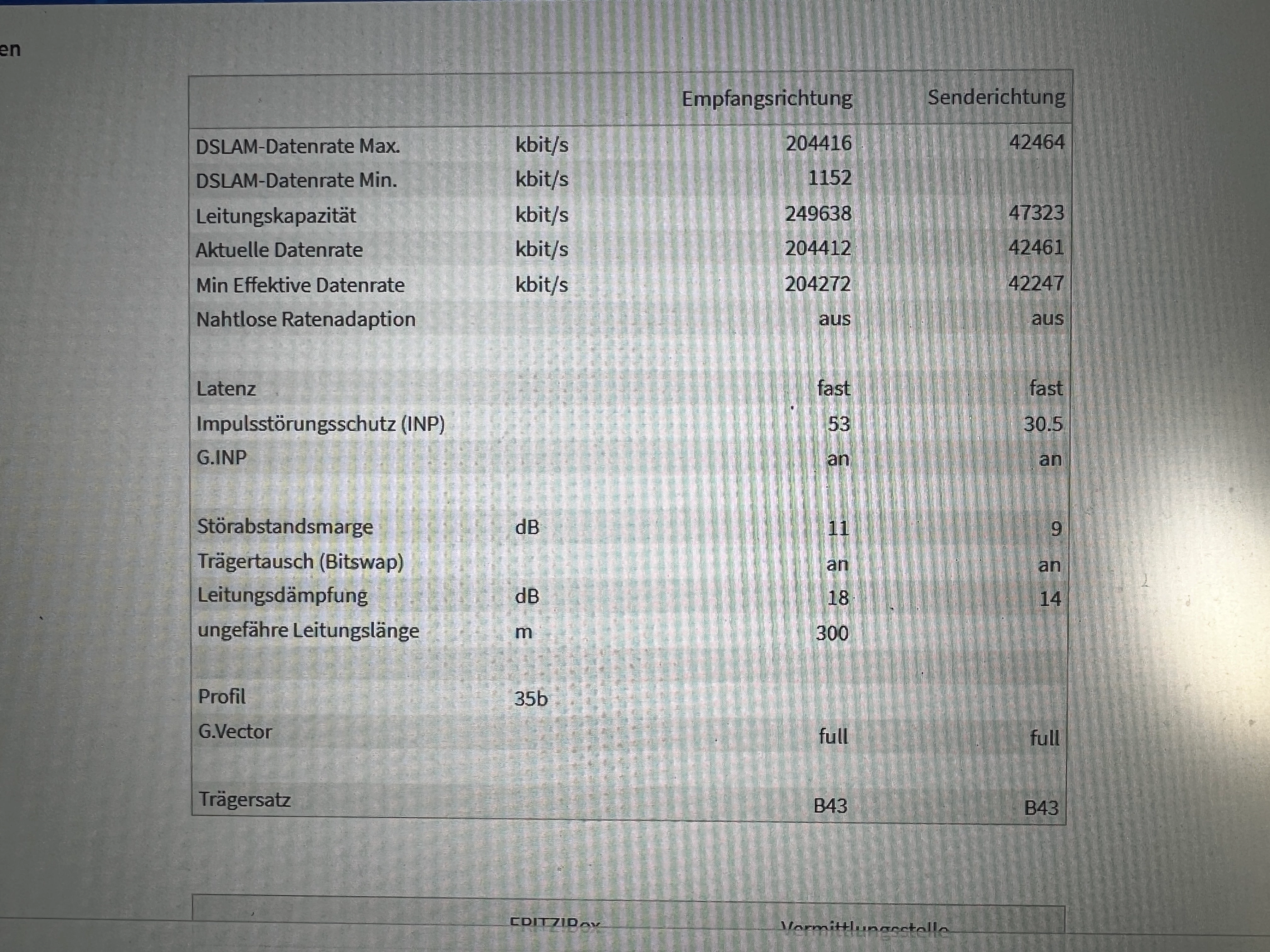 ich habe leider einige Verbindungsabbrüche wegen eines defekten Routers (7530AX) gehabt. Den habe ich nun ausgetauscht (gegen 7590AX) und habe währenddessen festgestellt, das meine DSL 250Bbit Leitung anscheinend gedrosselt wurde. Zuvor hatte ich immer ~ 220Bit - 225Mbit und nun nur noch ​↓ 204,4 Mbit/s ↑ 42,5 Mbit/s. Ich habe von dem alten Router die Daten gesichert und auf die neue 7590AX aufgespielt. Läuft jetzt auch ohne jegliche Abbrüche.
