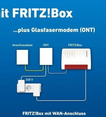 Habe die Fritzbox über den WAN Anschluss mit dem ONT verbunden. Wie auf dem Bild.