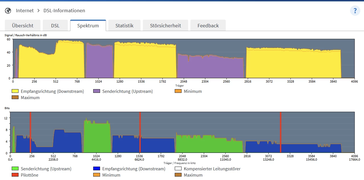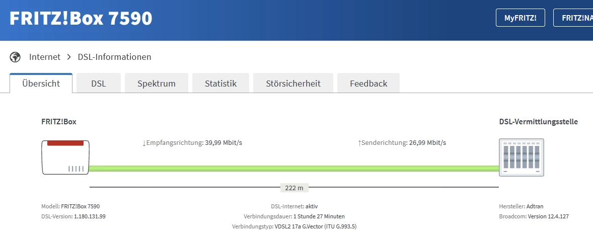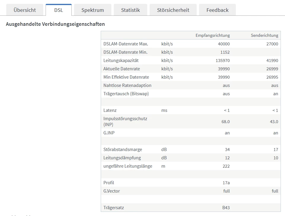 Nun kommen aber leider seit der Aktivierung allerdings nur 40 MBit/s im Download an. Laut meiner Fritzbox 7590 (aktuelles Fritz OS 7.50) beträgt die Leitungskapazität Empfang 135626 kbit/s und Senderichtung 41990 kbit/s. Ich weiß das die Leitungskapazität in der FB auch nur einen Rechen- bzw. Schätzwert seitens AVM darstellt, bin aber dennoch etwas verwundert das der Download sich unterhalb des nächstgünstigen Vertrages bewegt.