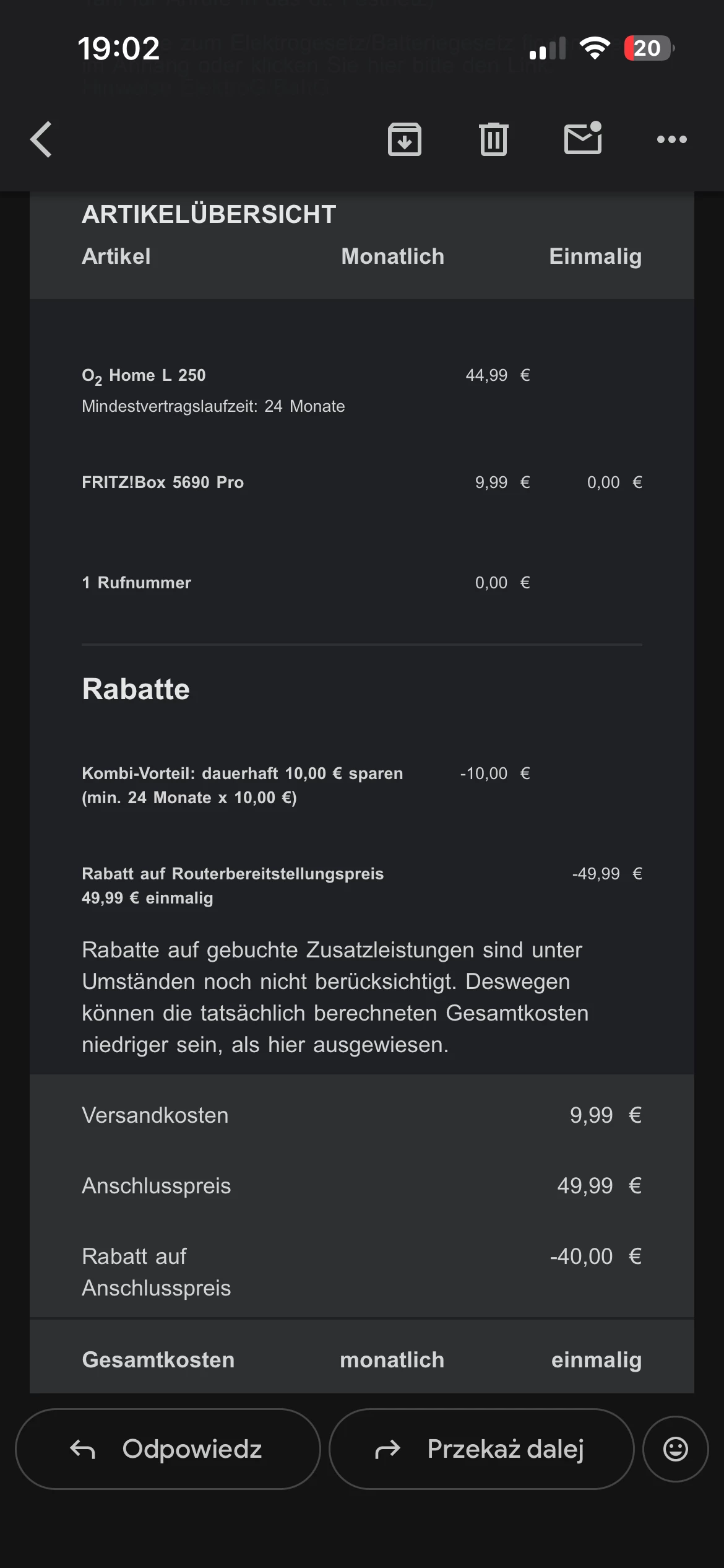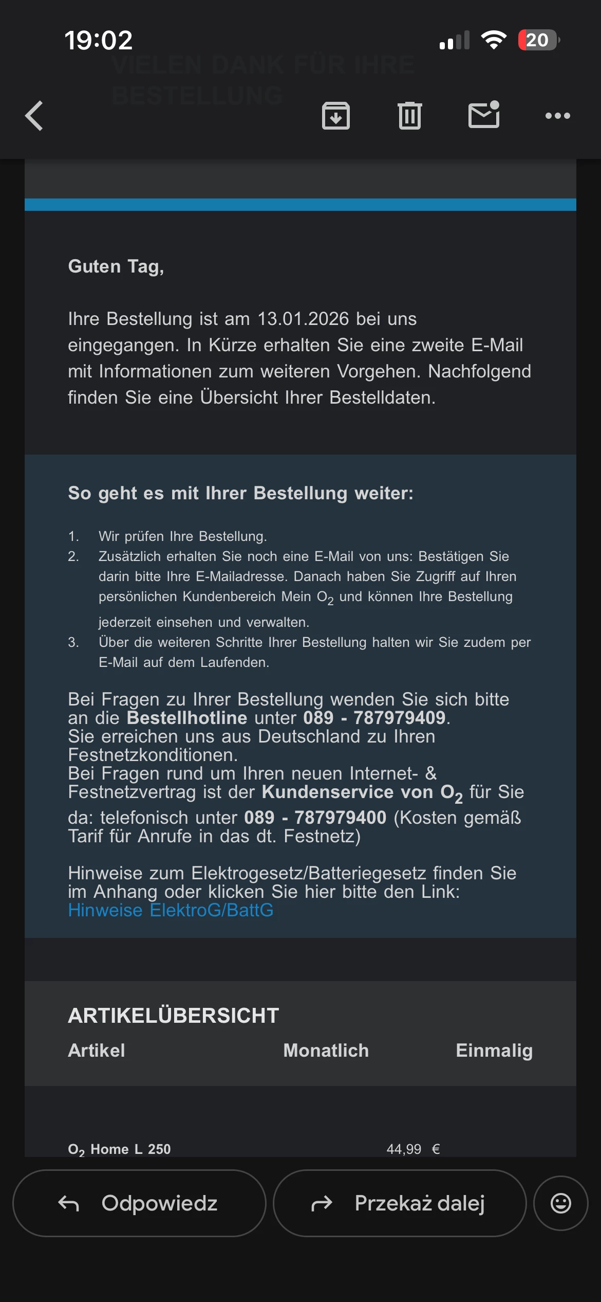 Hallo, am 13. Januar 2026 habe ich einen Antrag für L250 DSL-Internet gestellt, der mich ab März 2026 44,98 € pro Monat kosten sollte. Leider habe ich per Post eine Vertragsbestätigung über 54,98 € erhalten?! Habe ich etwa einen Vertrag über 44,98 € unterschrieben?! Ich füge einen Screenshot und ein Foto des per E-Mail erhaltenen Vertrags bei. Bitte korrigieren Sie meinen Vertrag, da er nicht mit dem ersten, von mir unterschriebenen Vertrag übereinstimmt.