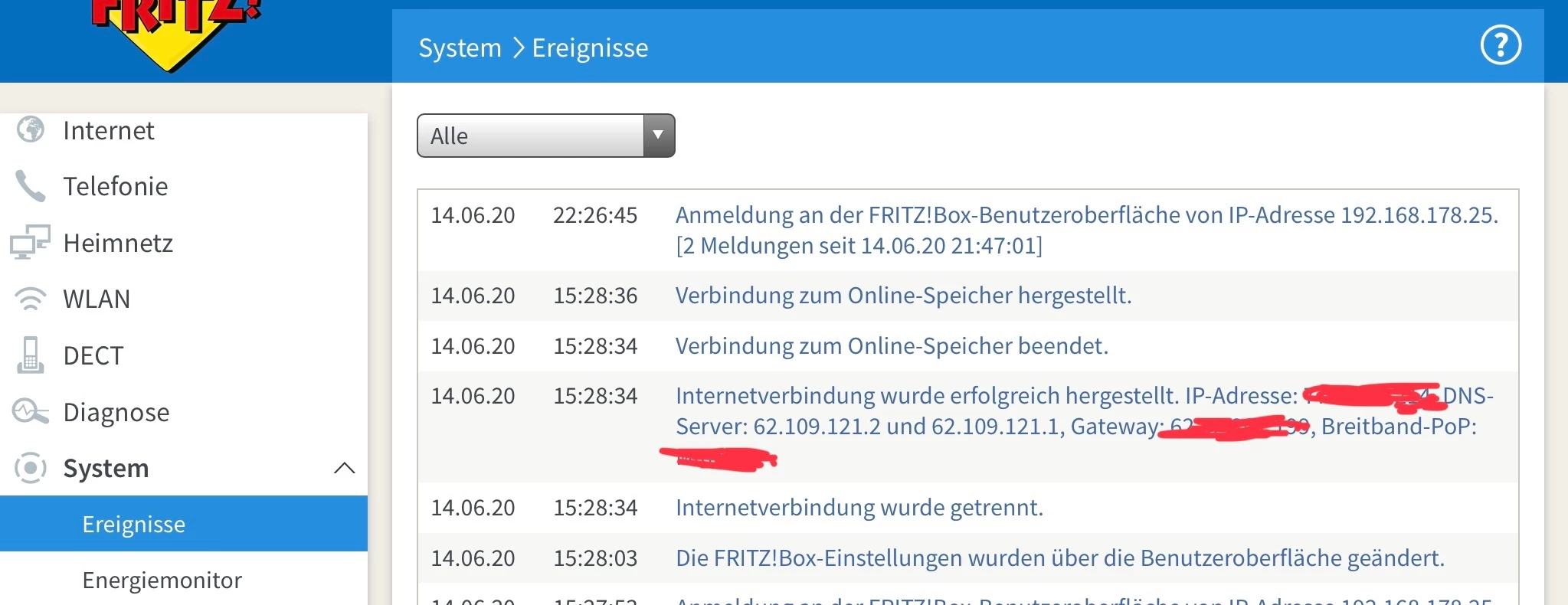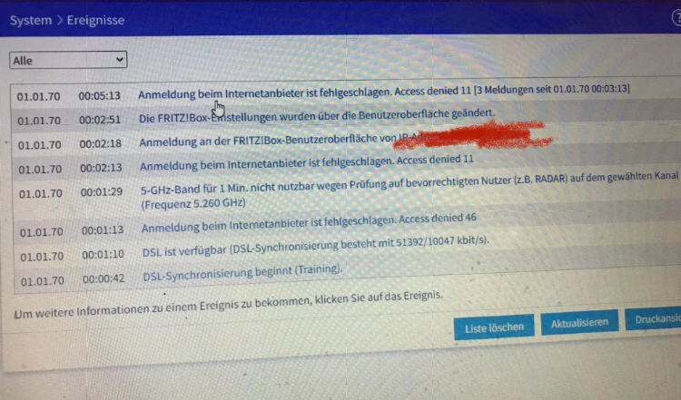 @iths2019 Power/DSL LED ist konstant an? Sind die o2 Zugangsdaten schon eingetragen worden? Was steht in der Ereignis Anzeige der Fritzbox (siehe Beispiel)