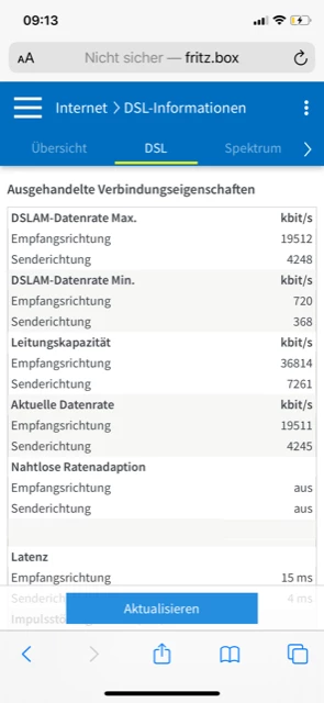 Ich hatte abends nach der Erstellung dieses Beitrags nochmal resettet und hatte bessere Werte (exakt 25Mbit down / exakt 5 Mbit up). Habe dann noch mal probiert den Anschluß an die Telefondose zu optimieren (kurzes CAT 7 Kabel + RJ45-TAE Adapter). Gebracht hat es nichts.