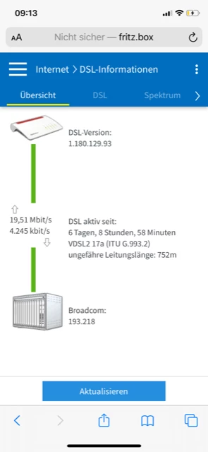Wenn ich die Diagnose an meiner Fritzbox starte,  werden mir 19,5 Mbit angezeigt – Jenes deckt sich auch ungefähr mit einem DSL-Speedcheck am Laptop oder Smartphone: