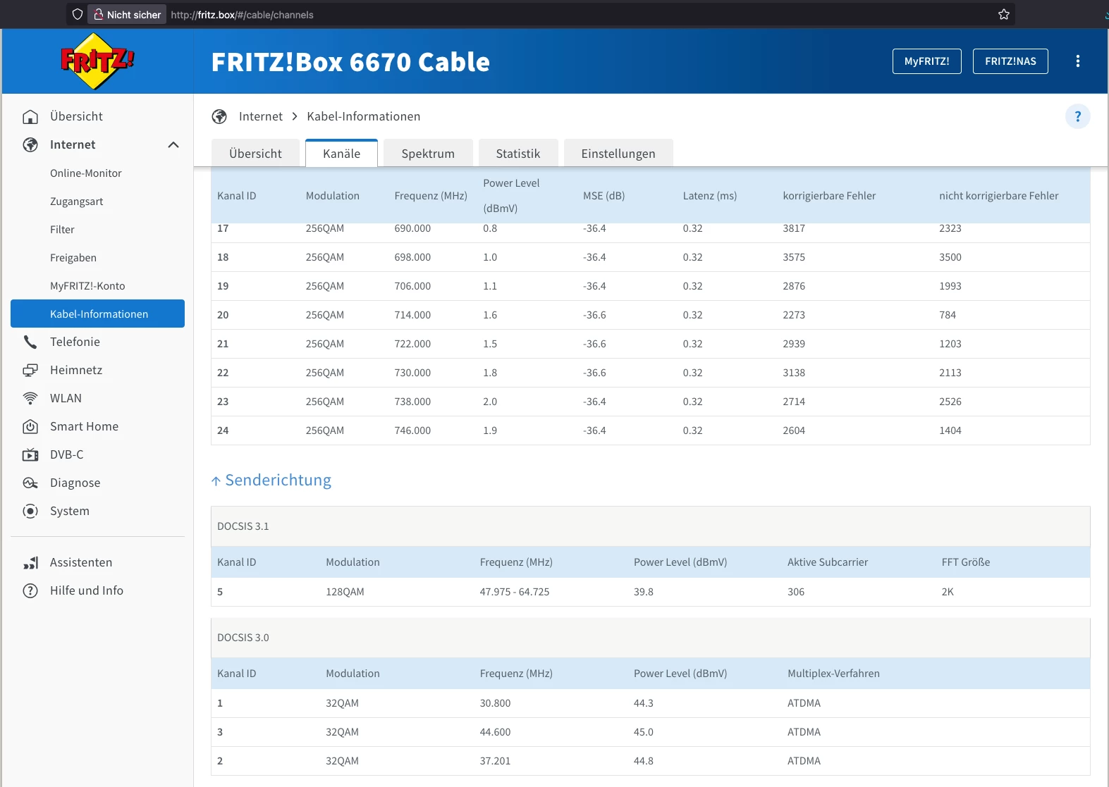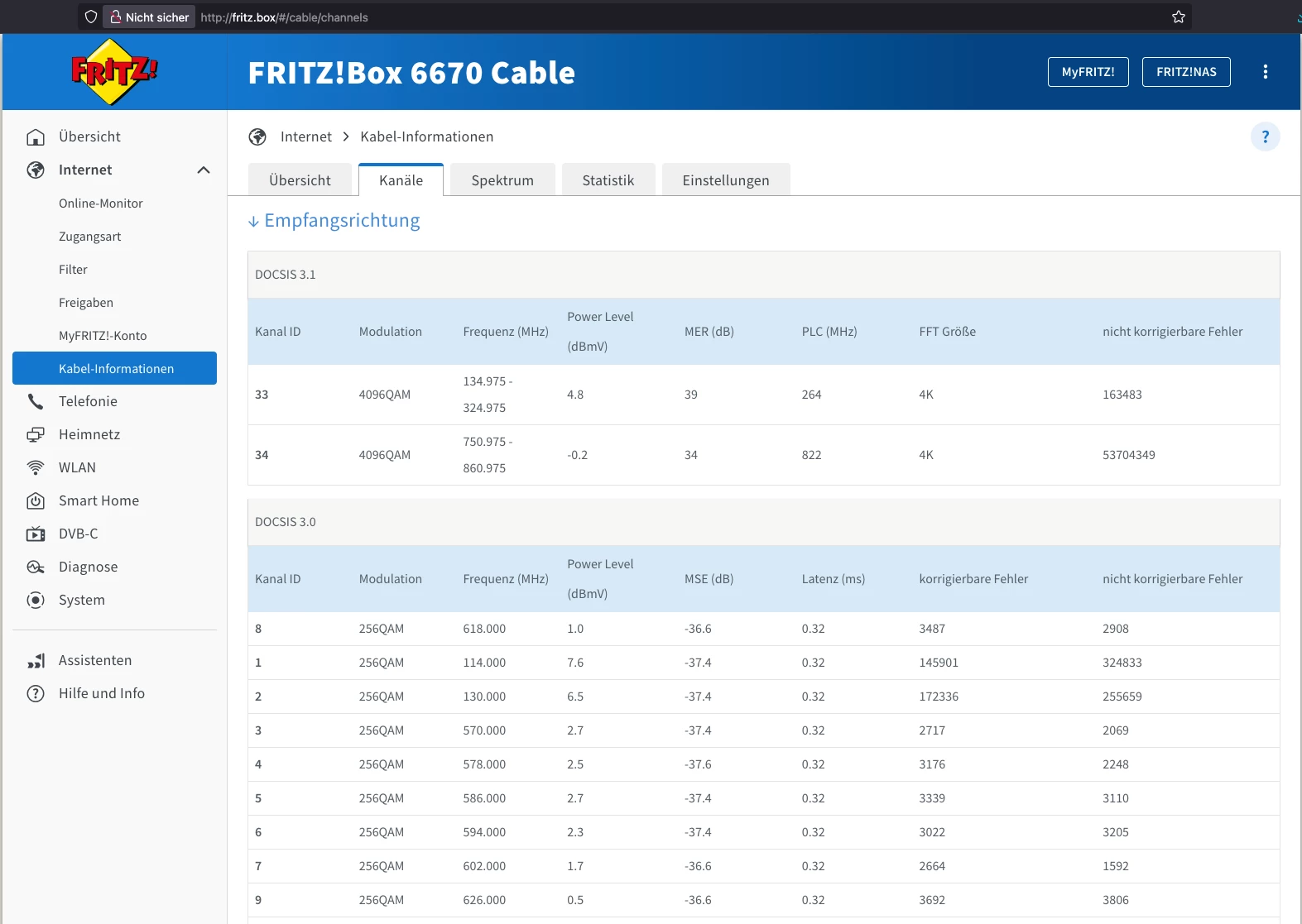 Es hat ewig gedauert, bis die FritzBox die DOCSIS Kanäle finden konnte und auch wenn die Verbindung. nun erst seit 2,5 Stunden besteht, hat sich die Anzahl der nicht korrigierbaren Fehler bereits wieder auf 3,6 Millionen(!) angehäuft.