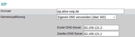 Falls es jemanden interessiert: In der Auerswald Anlage (hier Compact 4000) kann beim Anbieter u.a. der DNS geändert werden. Damit gibt es nicht mehr das Problem der Namensauflösung von “sip.alice-voip.de”.