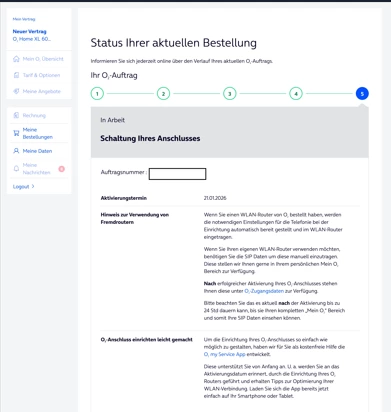 Sobald der Status deiner Bestellung “Installation abgeschlossen” lautet, kann der Router angeschlossen werden. Ist dann die O₂ Startseite sichtbar, kann telefonisch eine Terminvorziehung beauftragt werden. Bitte beachte, dass dieser Termin ab dem Tag der Anfrage plus zwei Werktage in der Zukunft liegt. Eine sofortige Aktivierung ist nicht möglich.