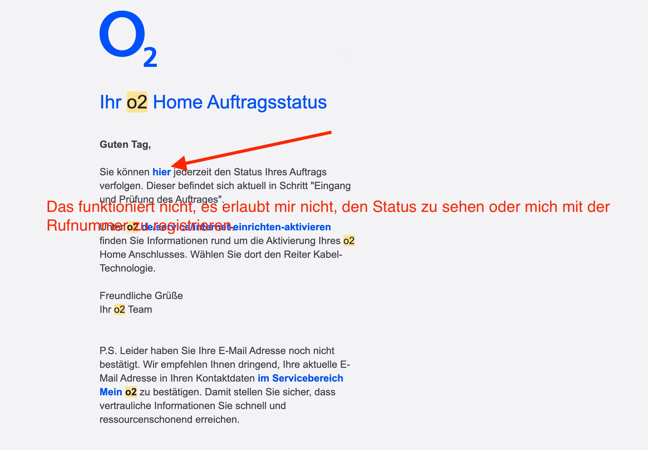 Noch einmal: Ich kann meinen „Status deiner Bestellung“ nicht sehen, weil die Links aus den O2-E-Mails nicht funktionieren. Sie lassen mich nicht einloggen, das ist ein technisches Problem.