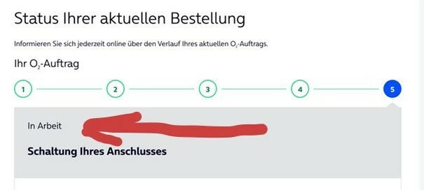 Sobald der Status deiner Bestellung “Installation abgeschlossen” lautet, kann der Router angeschlossen werden. Ist dann die O₂ Startseite sichtbar, kann telefonisch eine Terminvorziehung beauftragt werden. Bitte beachte, dass dieser Termin ab dem Tag der Anfrage plus zwei Werktage in der Zukunft liegt. Eine sofortige Aktivierung ist nicht möglich.