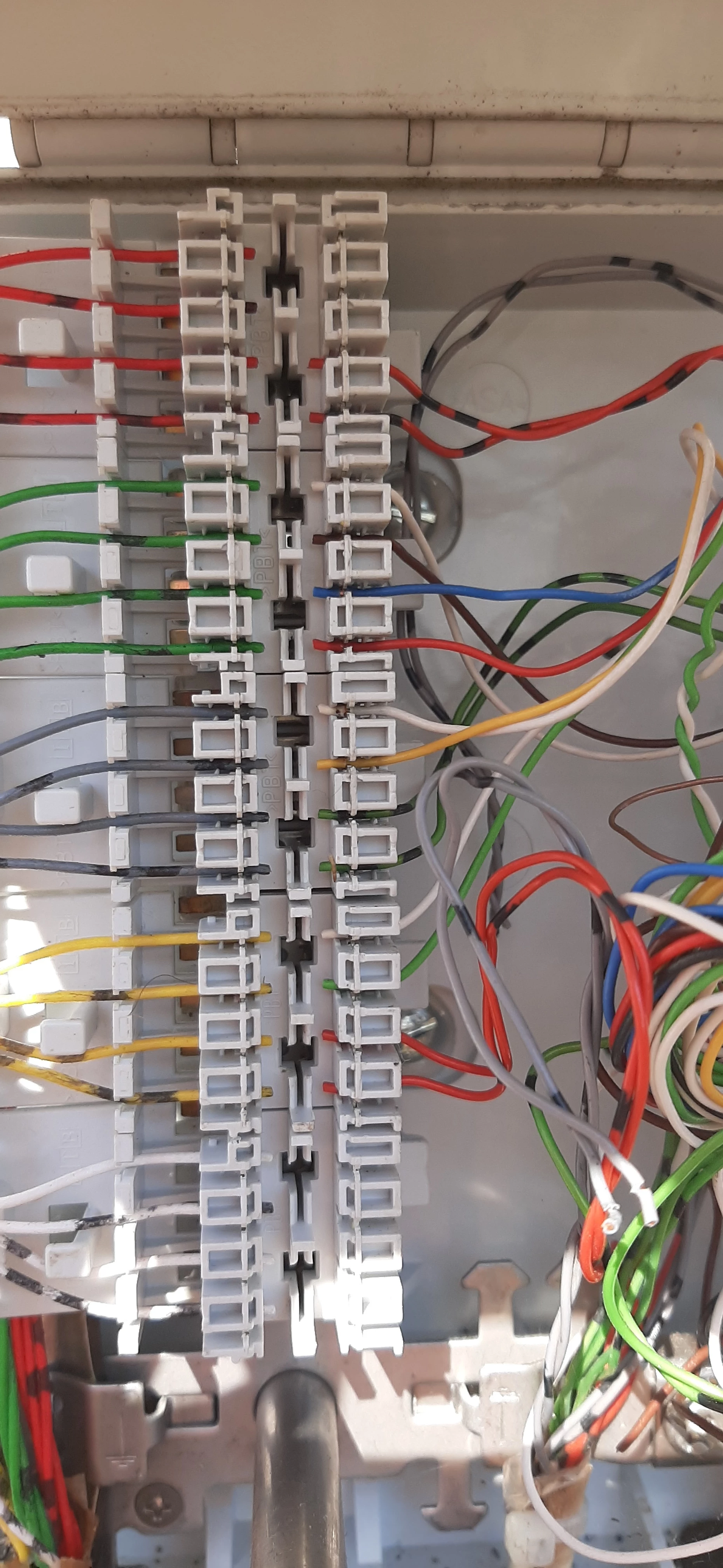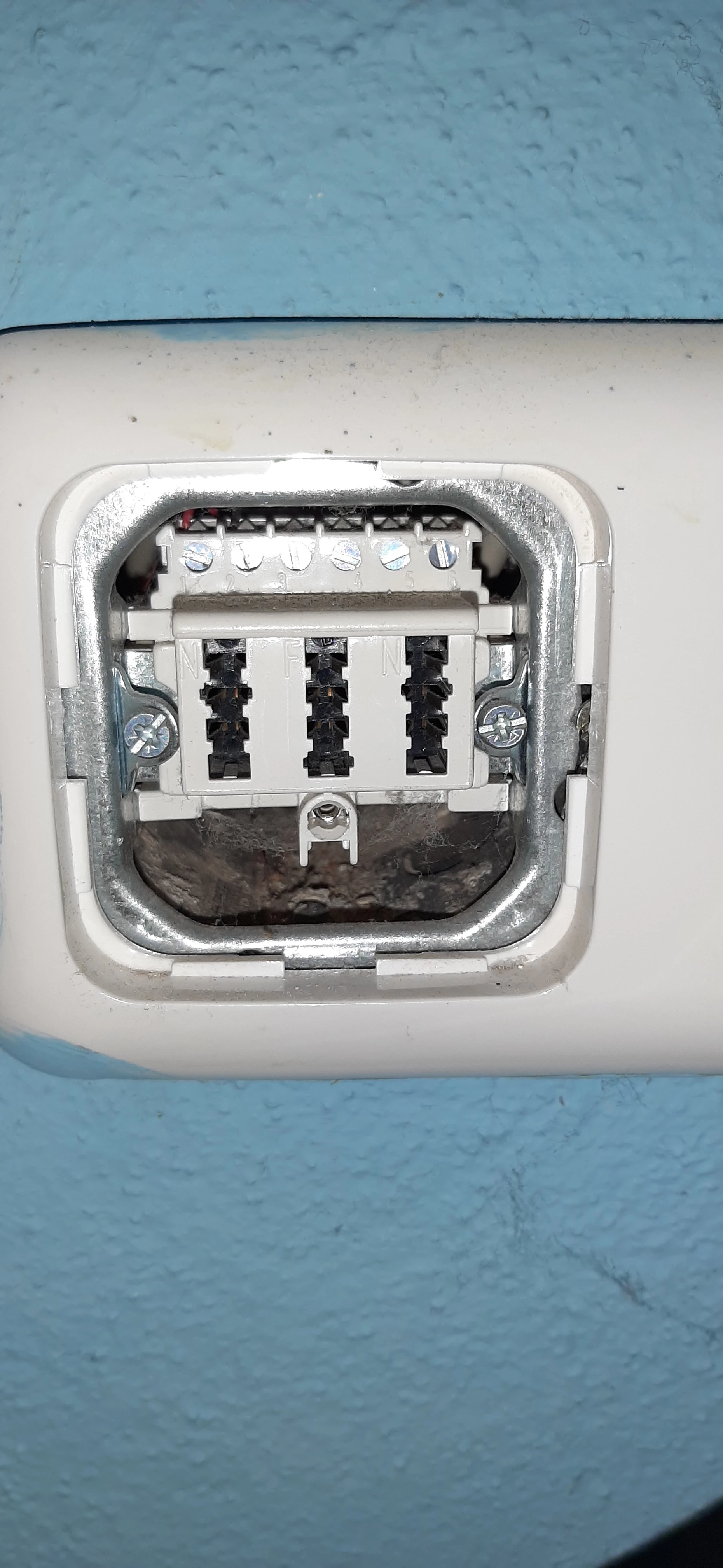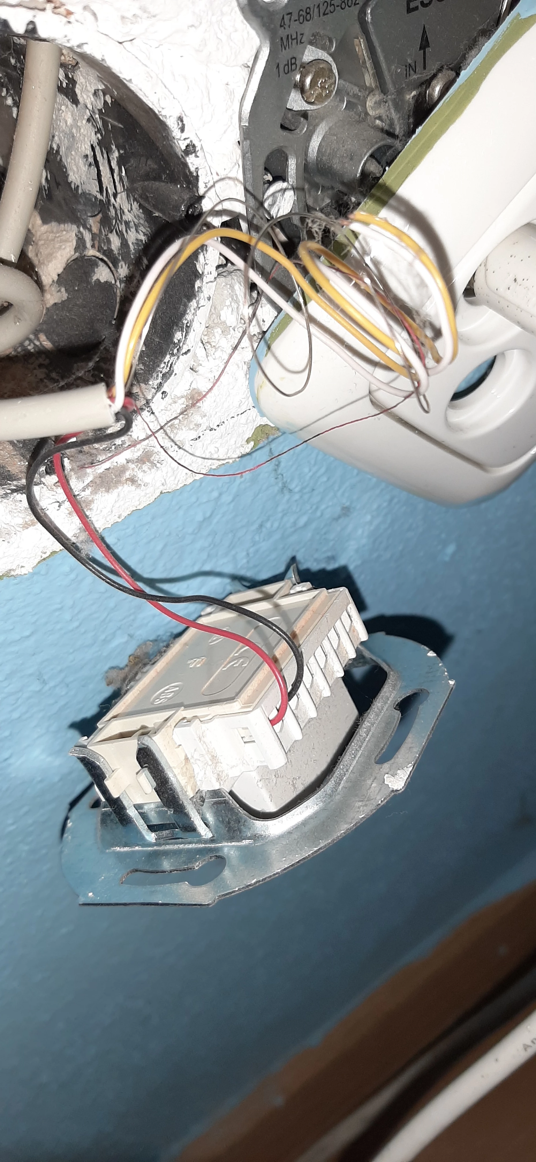 Kann es sein, dass bei der Dose mit der blauen Tapete zwei rote Kabel auf Schraube 1 (ganz links) und zwei schwarze Kabel auf Schraube 2 (zweite von links) angeschraubt sind?
