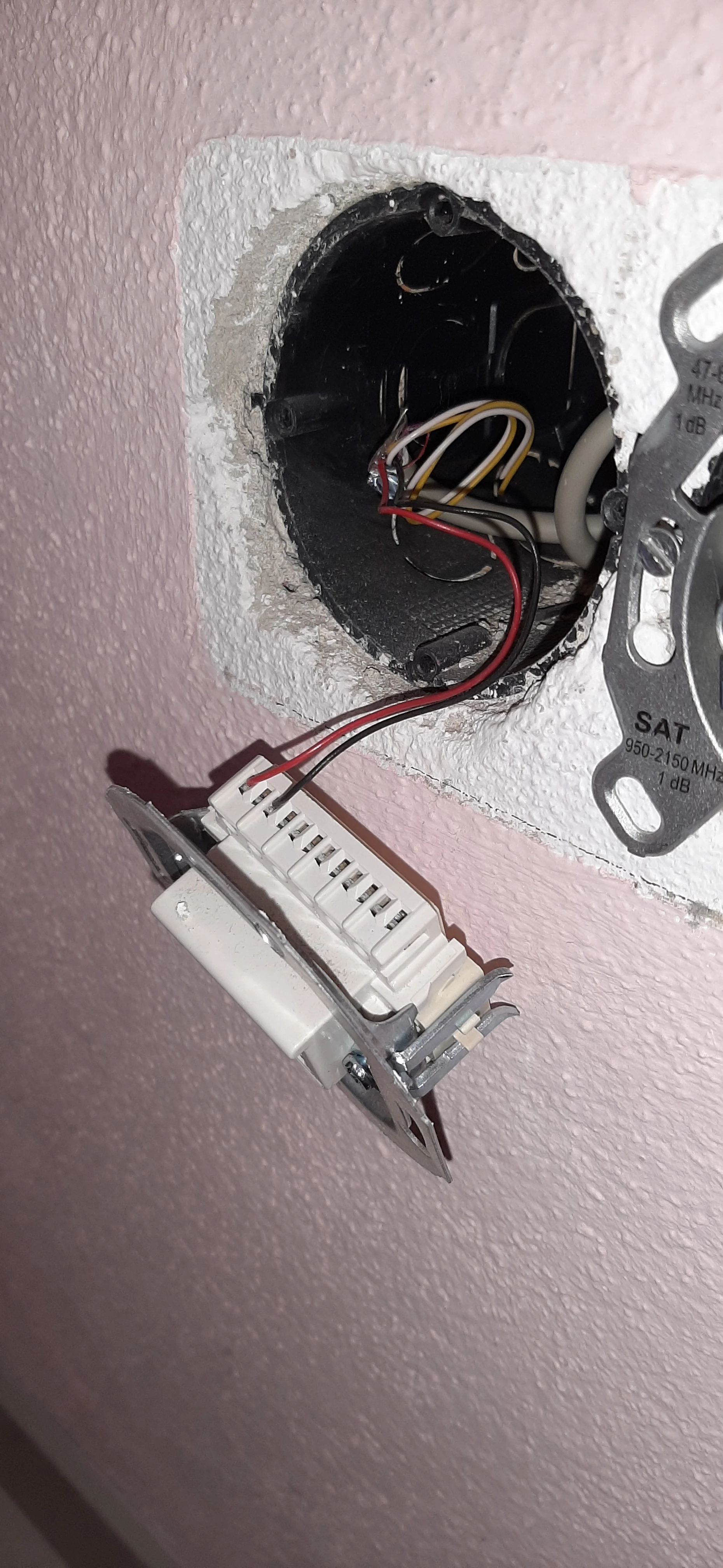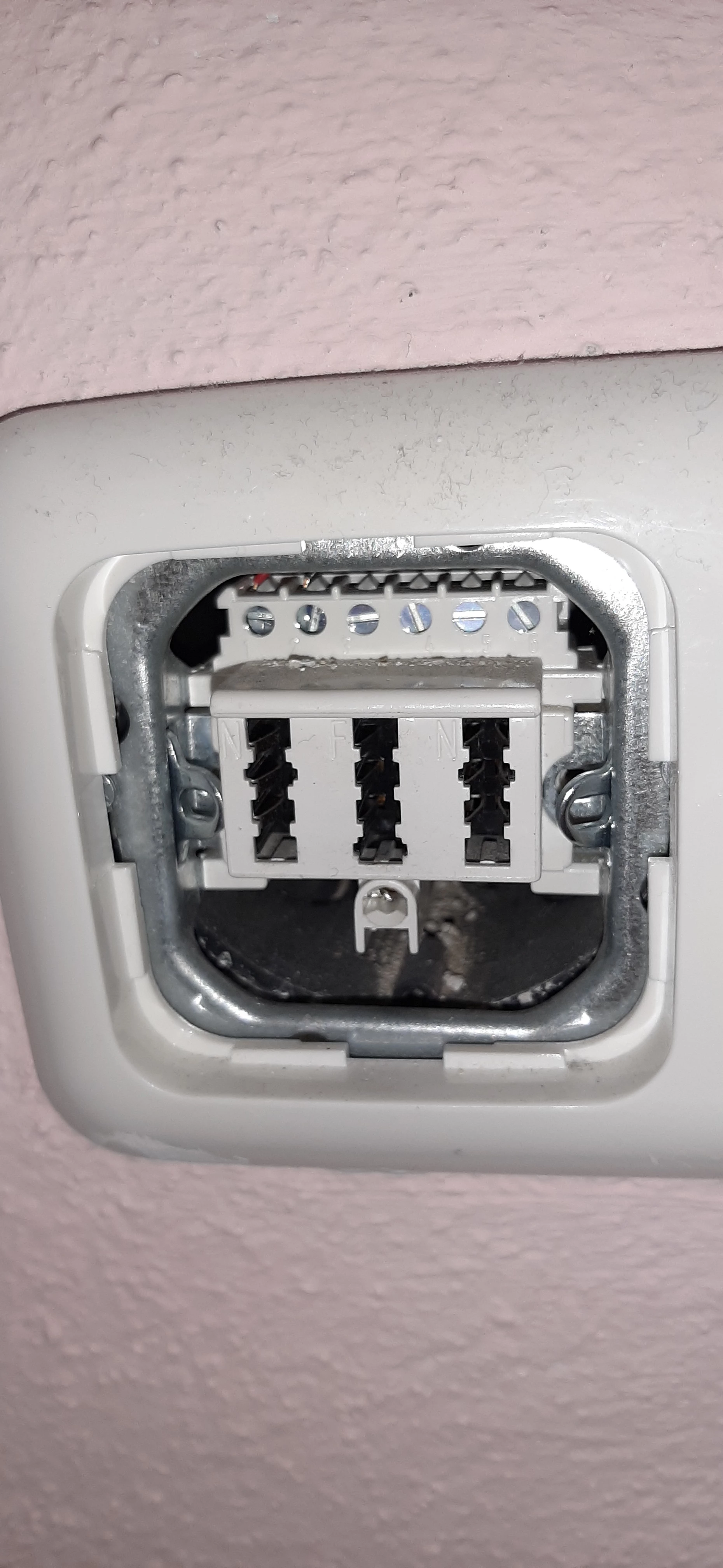 Die andere Dose mit der “rosa” (?) Tapete ist ok. Du könntest aber mal an den Kabeln ziehen und schauen, ob die Kabel wirklich ganz fest sitzen. Da es sich um Schraubklemmen handelt, kann sich hier leicht ein Wackelkontakt einschleichen.