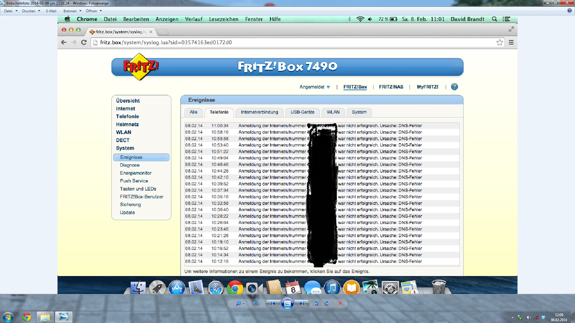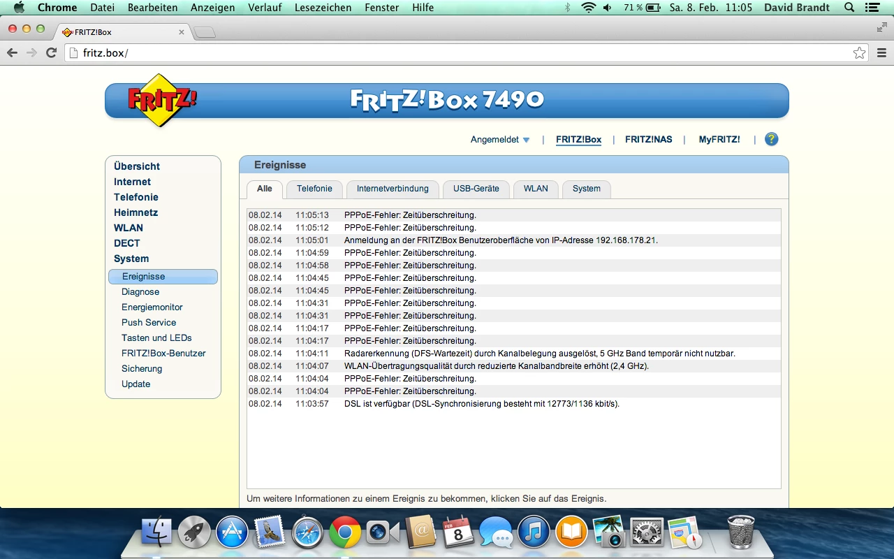 Über Nacht habe ich die Fritzbox eingeschlossen gehabt. Die Fritzbox und O2 Box funktionieren beide am Anfang einwandfrei. Nach einer gewissen Zeit funktioniert allerdings das Internet nicht mehr, dass heißt es ist mit dem Wlan verbunden Dsl steht, Internet auch allerdings wird keine Seite mehr geladen, wo ja dann das Telefon auch nicht mehr und dann treten halt die Fehler in den Ereignissen da.