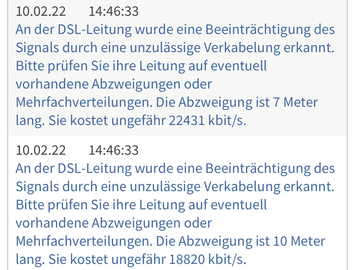 In der Wohnung nicht. Nur im technikraum in dem Haus (8 Parteien). Da die Meldung auch erst seit ca 2 Monaten Auftritt dachte ich dass ein Nachbar gegebenenfalls eine neue Leitung bekommen hat und dann ein Techniker etwas neue verzweigt oder abgeklemmt hat? In den Technikraum kommt man nur mit Termin da eben so sensibel Sachen wie die Vernetzung und Heizung ist.